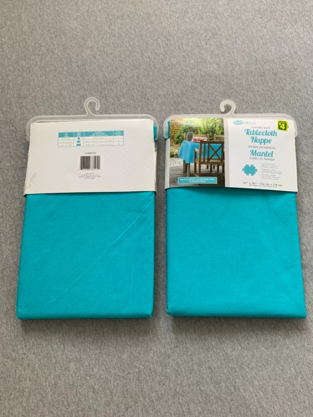 $3 each Vibrant turquoise colour. Measures 52" x 70" (132 cm x 178 cm). The tablecloth has a flannel back, making it perfect for outdoor use. Made of PEVA plastic, it's easy to clean and maintain.