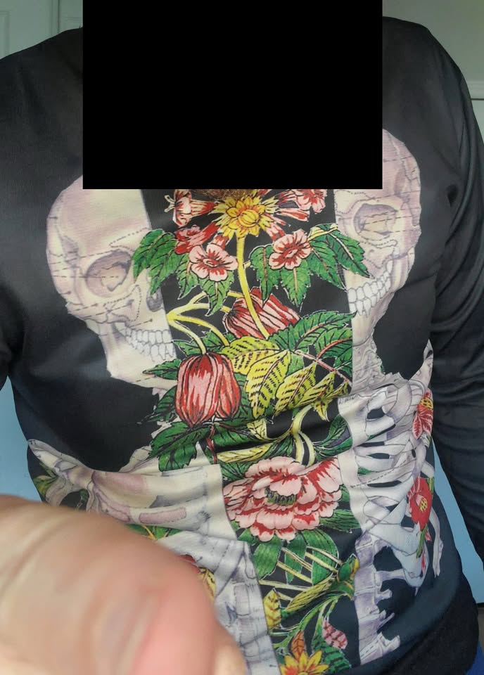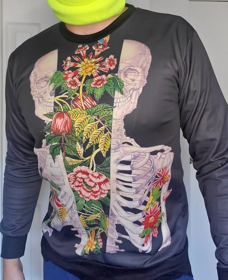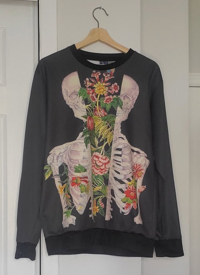 Skeleton flowers printed sweatshirt. Shimmery warm material. 1991 Inc. bought online. Asian XL/US Medium-Large.