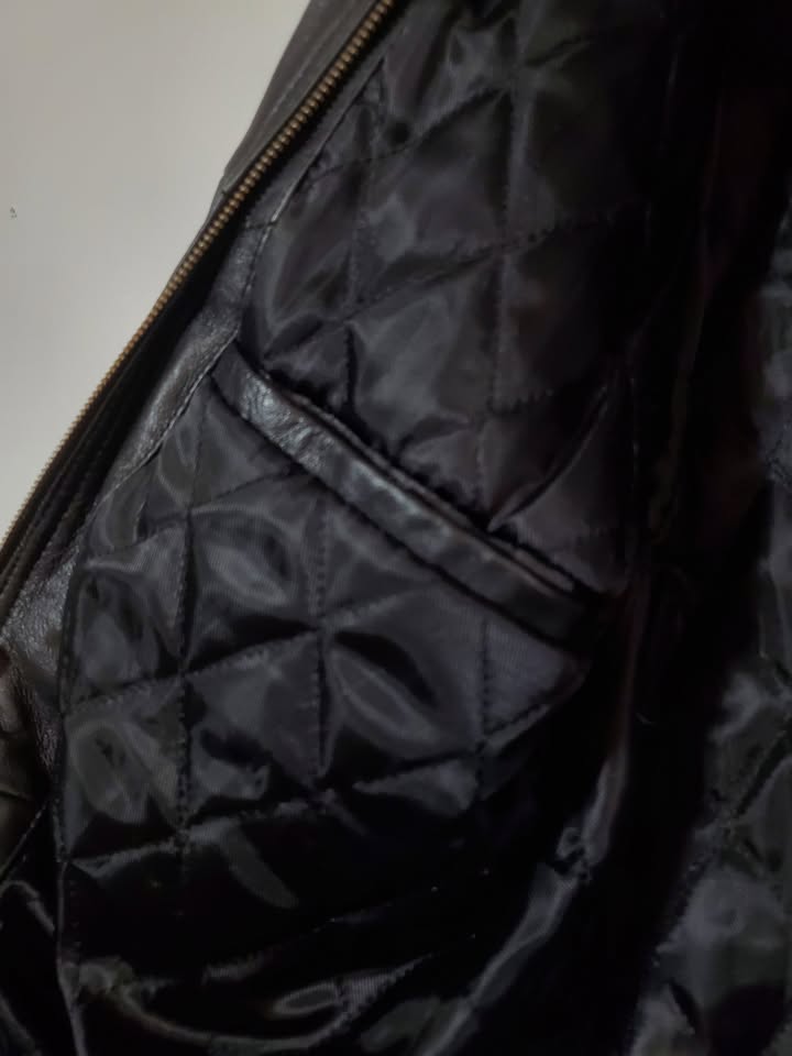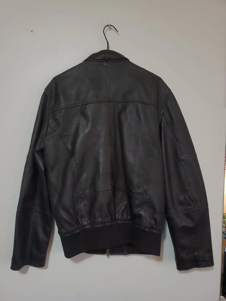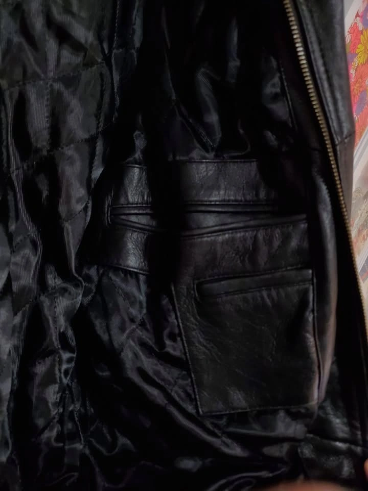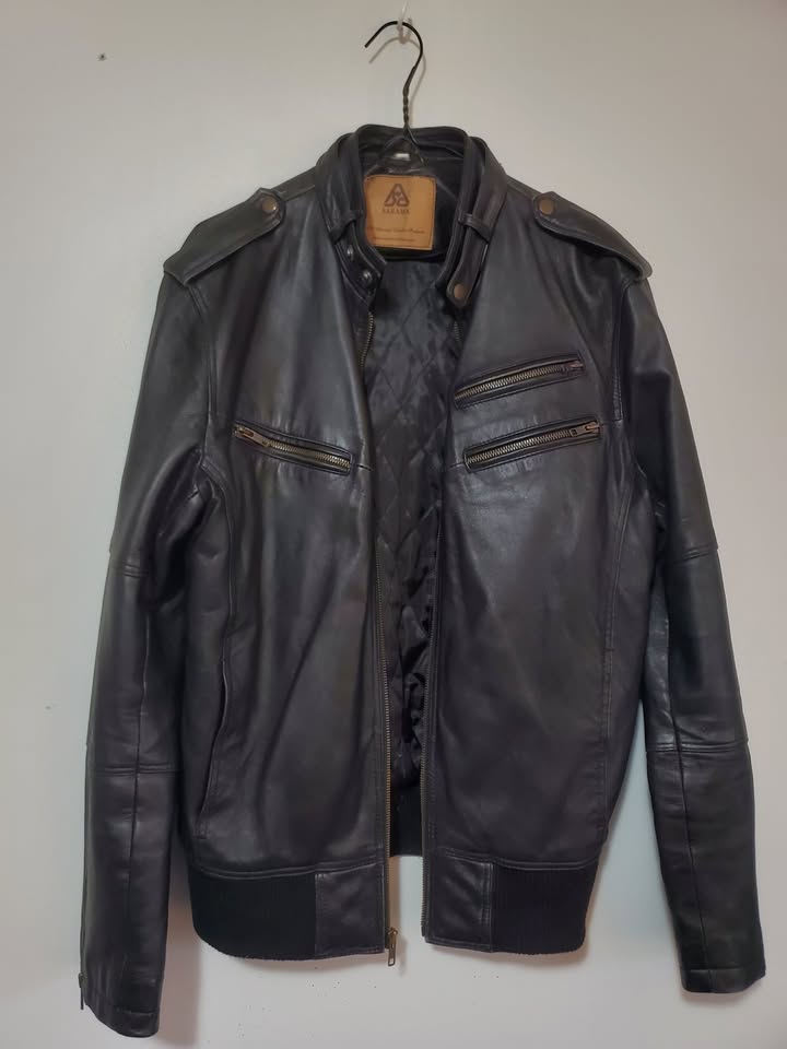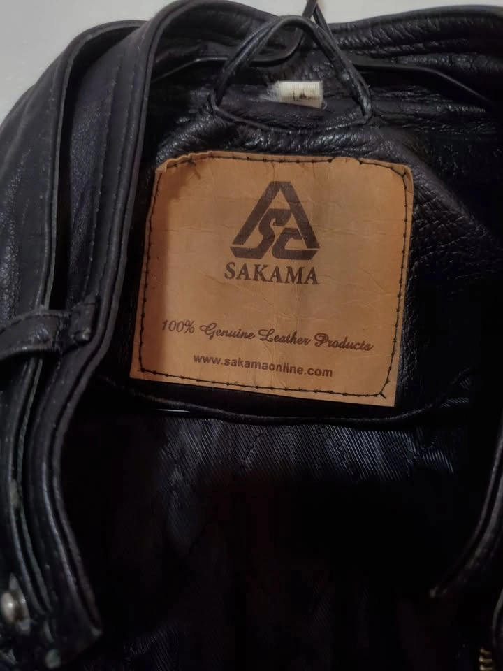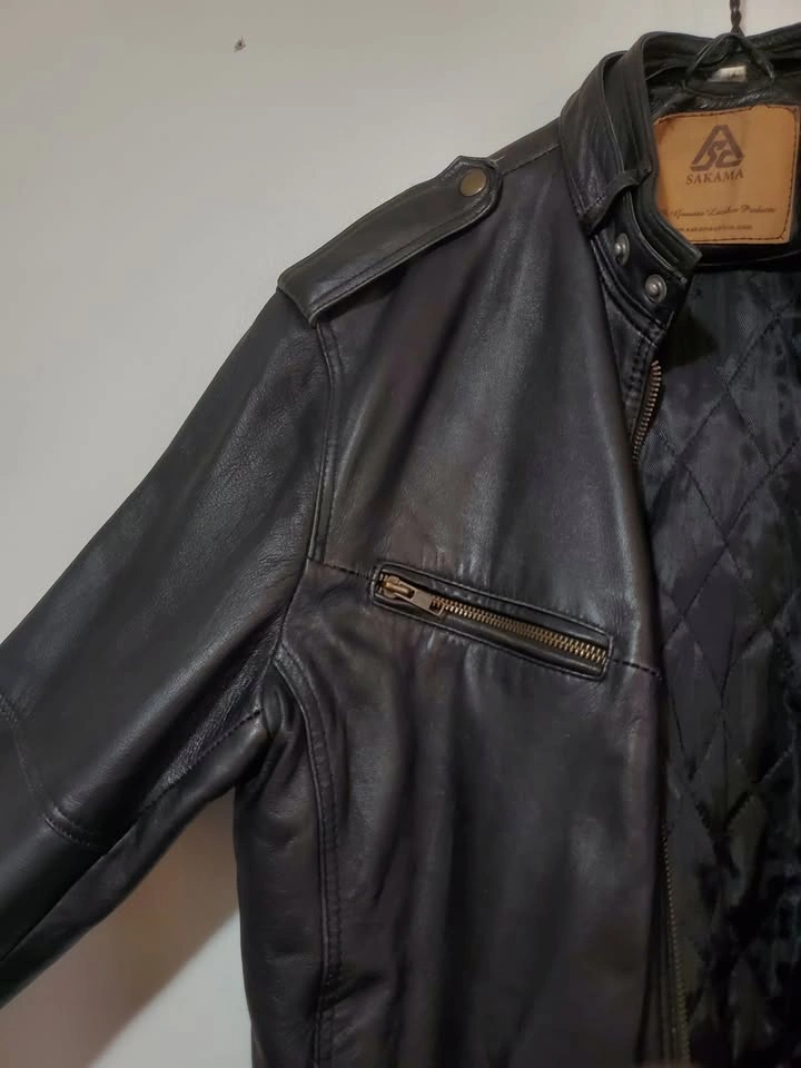 Sakama black leather jacket. 100% genuine leather. Barely worn. Stylish, epaulettes, many pockets including various inside pockets. Soft, quilted lining.