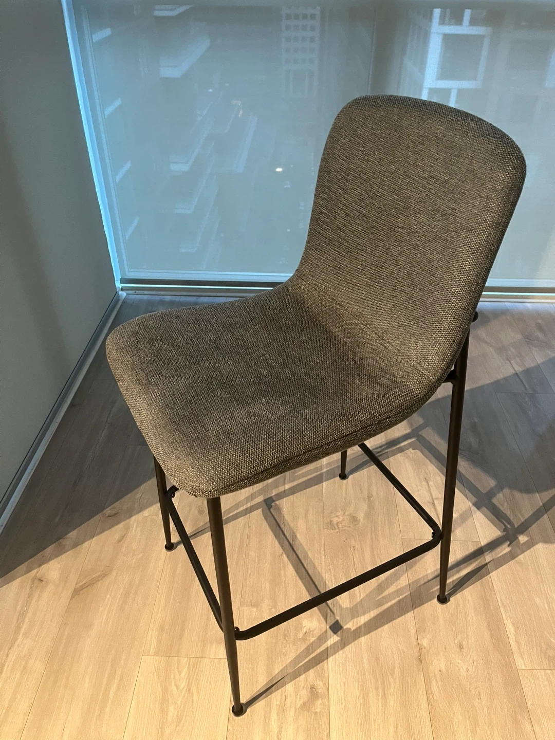 Selling 3 grey upholstered bar stools. They are basically new and would look great in any kitchen or bar area. The seat is comfortable and the frame is sturdy. It's a stylish and practical addition to your home