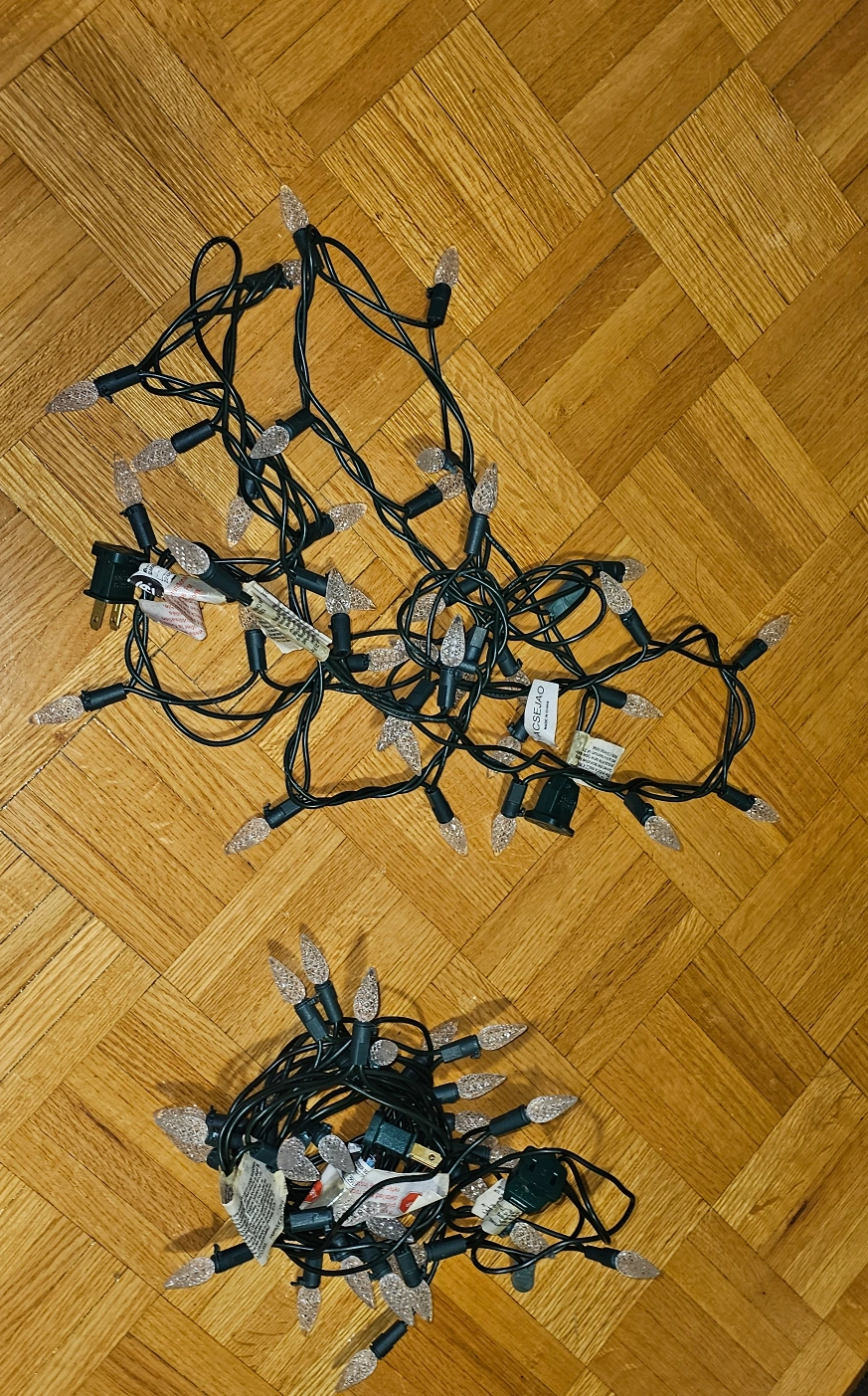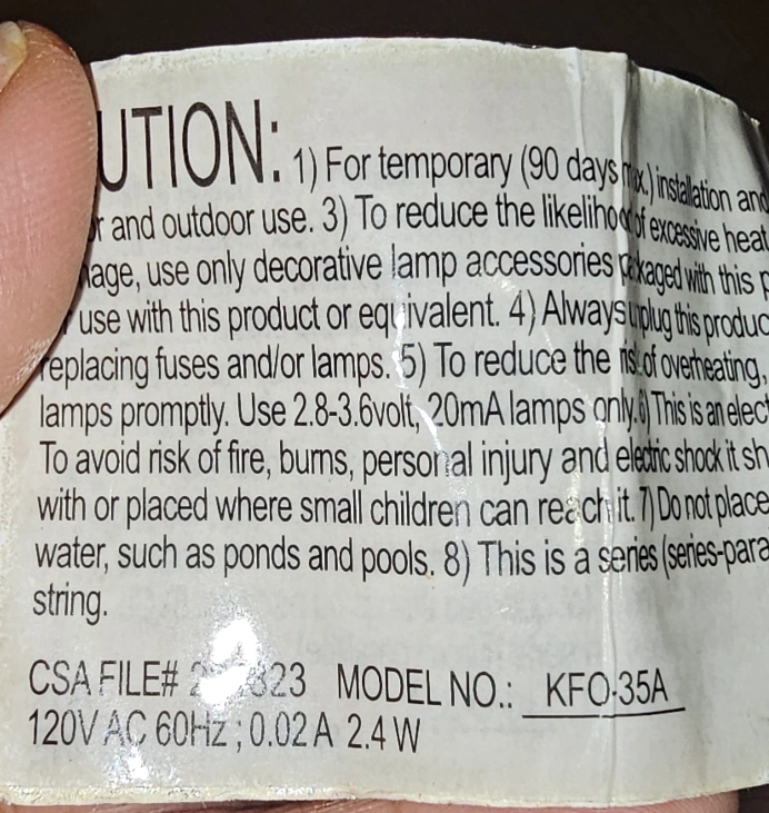 Selling a set of string lights, model number KFO-35A. They're suitable for temporary indoor and outdoor use. Please use only decorative lamp accessories packaged with the lights. Use 2.8-3.6 volt, 20mA lamps only