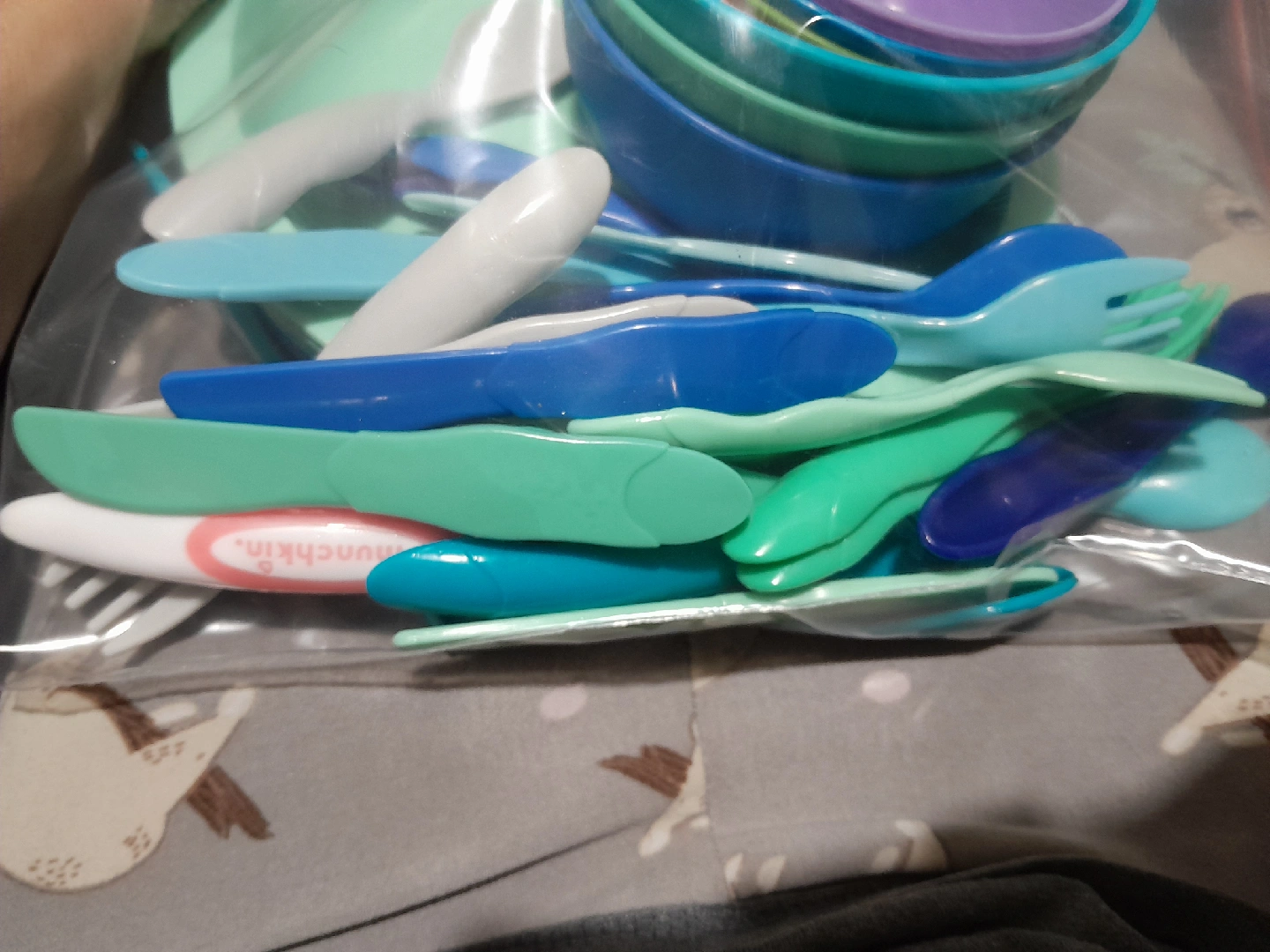 Selling a set of Munchkin baby bowls and utensils! The set includes bowls in various colours like blue, purple, and green, along with matching spoons, forks, and knives. Perfect for starting solids or for toddlers learning to feed themselves