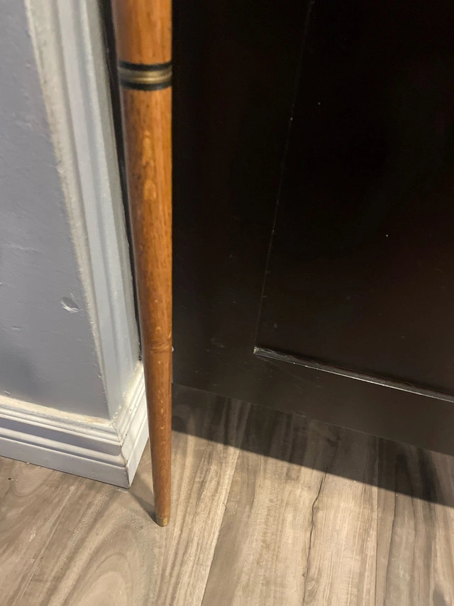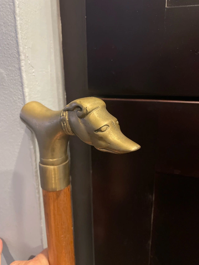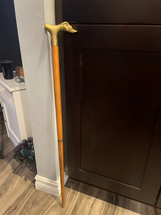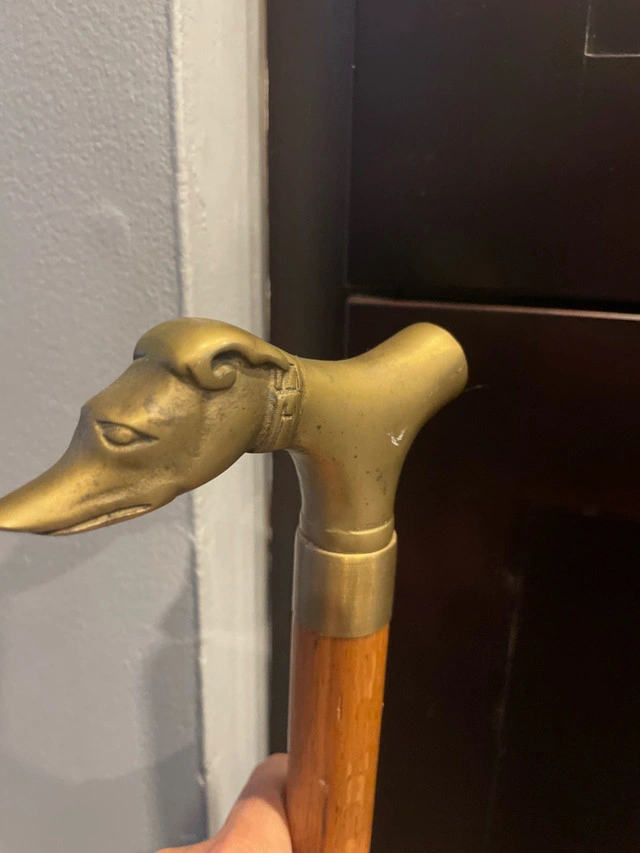 45This walking stick features a brass dog head handle and a sturdy wooden shaft. It's a stylish and functional accessory that adds a touch of vintage charm to any outing. This item has been previously enjoyed and shows signs of wear consistent with its age. * Handle Material: Brass * Shaft Material: Wood * Design: Dog head