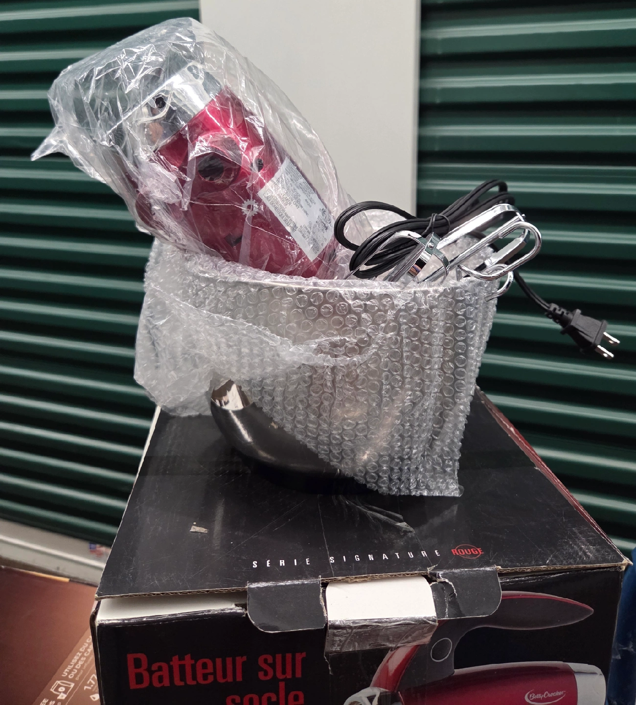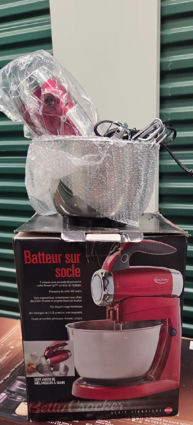 Selling a brand new Betty Crocker Signature Red Series stand mixer! It comes in the original box and includes all components. It has 7 speeds with turbo power and a 300-watt peak power motor. The mixer features ergonomic design with a tilting head and soft-touch handle, plus chrome accents. The stainless steel mixing bowl is dishwasher-safe and holds 3.0L (3 pints). Also included are chrome-plated beaters and dough hooks