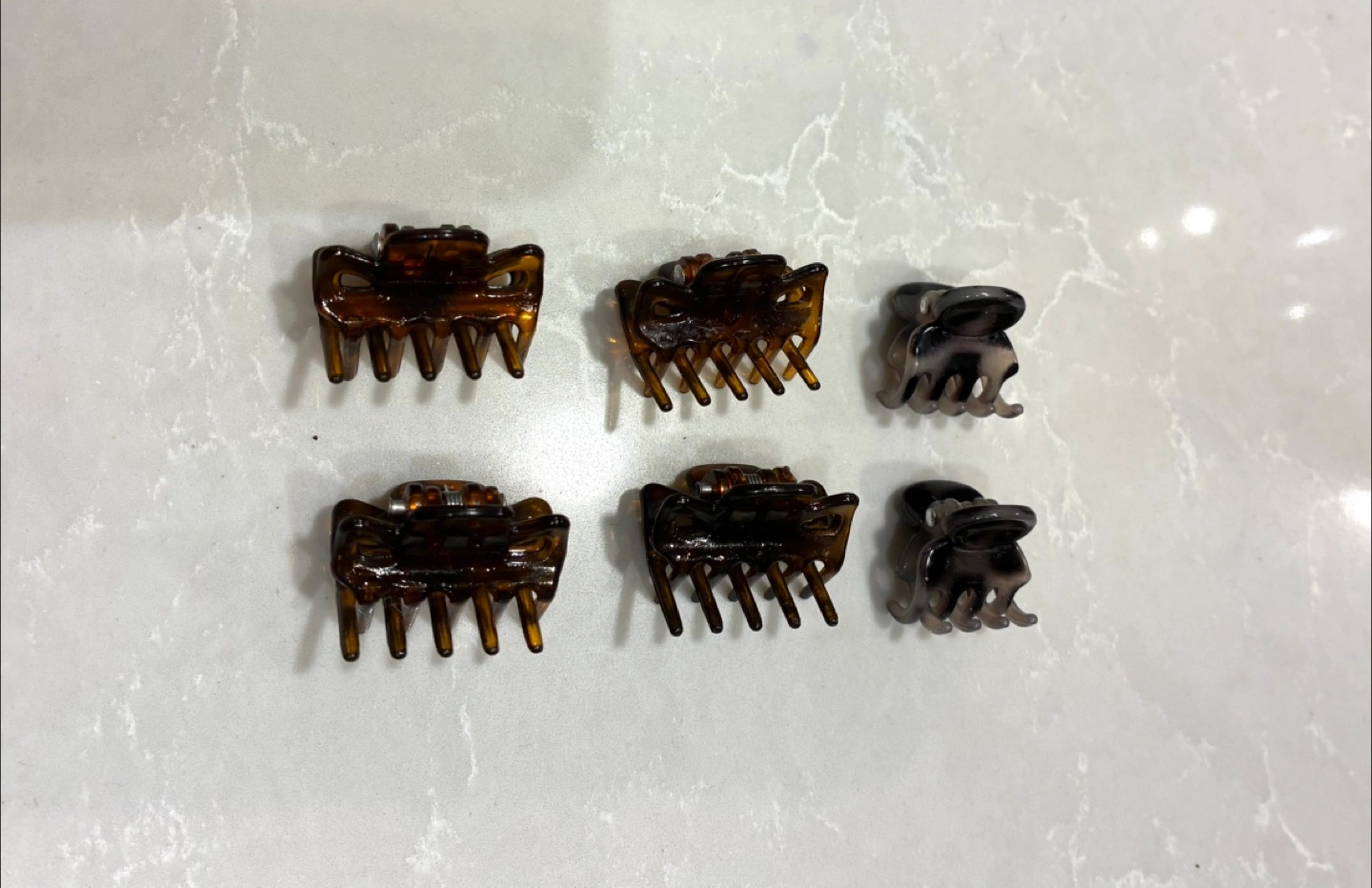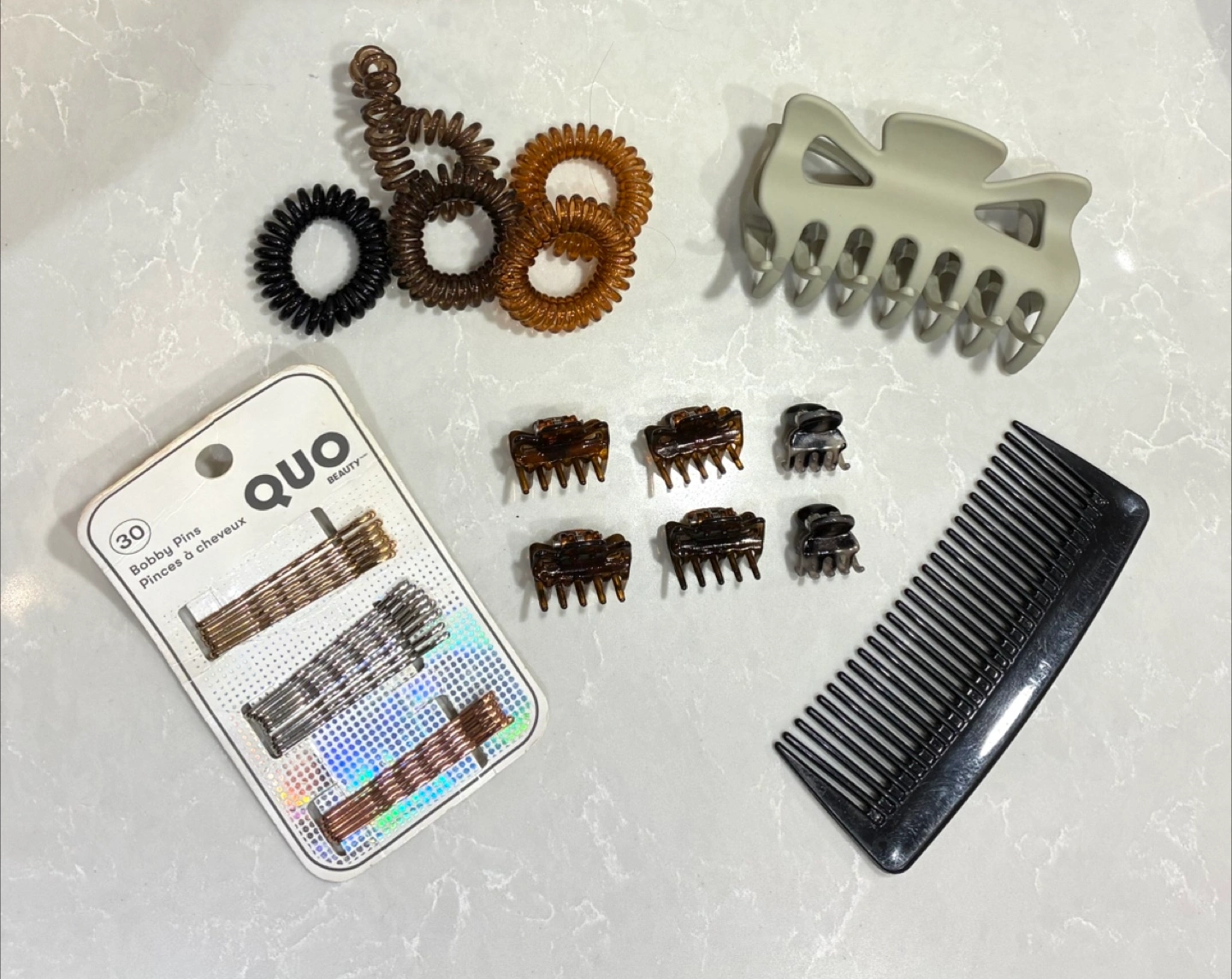 Includes claw clip, comb, 5 plastic hair ties, 6 small hair clips, and shiny bobby pins (19). All items are clean and in great condition! Selling all of them together.