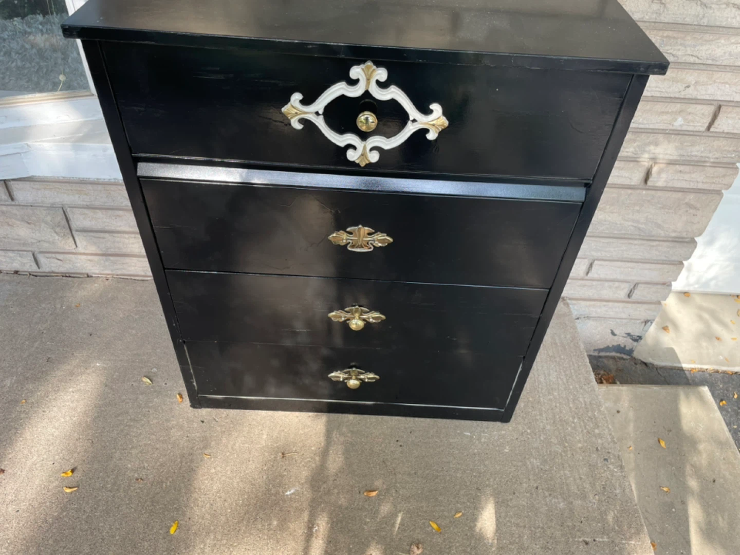 Selling a black four-drawer chest. It has some wear and tear, but it's still sturdy and functional. The dresser features decorative gold and white accents on the top drawer and gold handles on the remaining drawers. Perfect for extra storage!