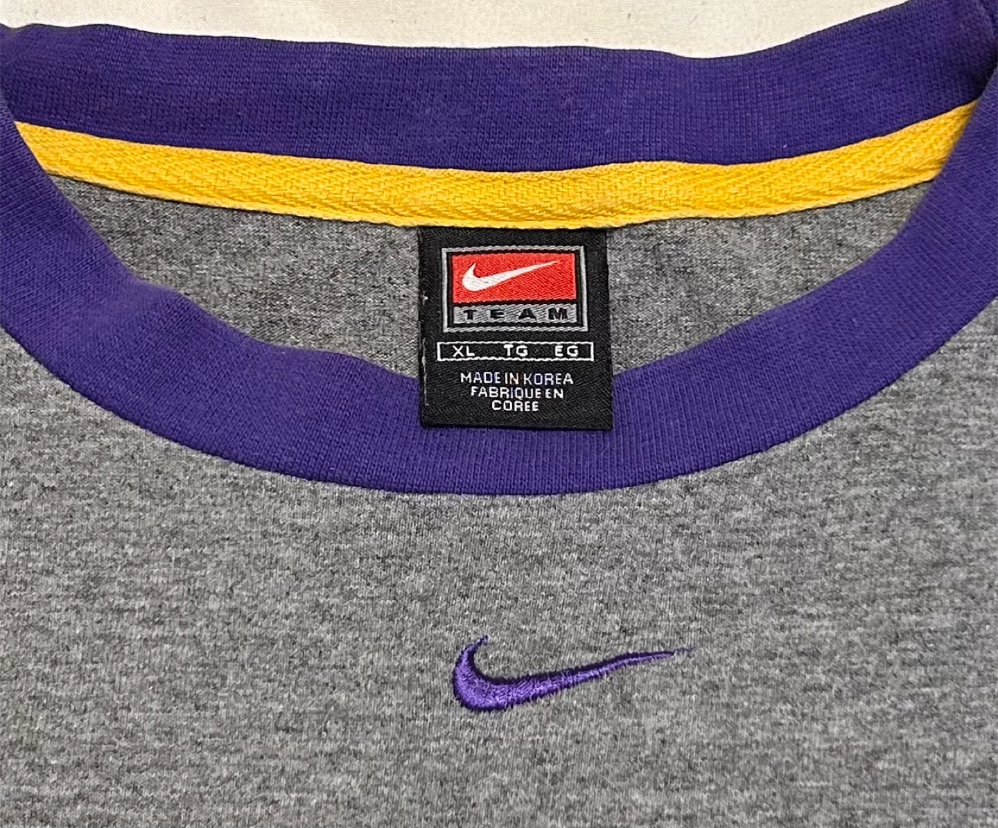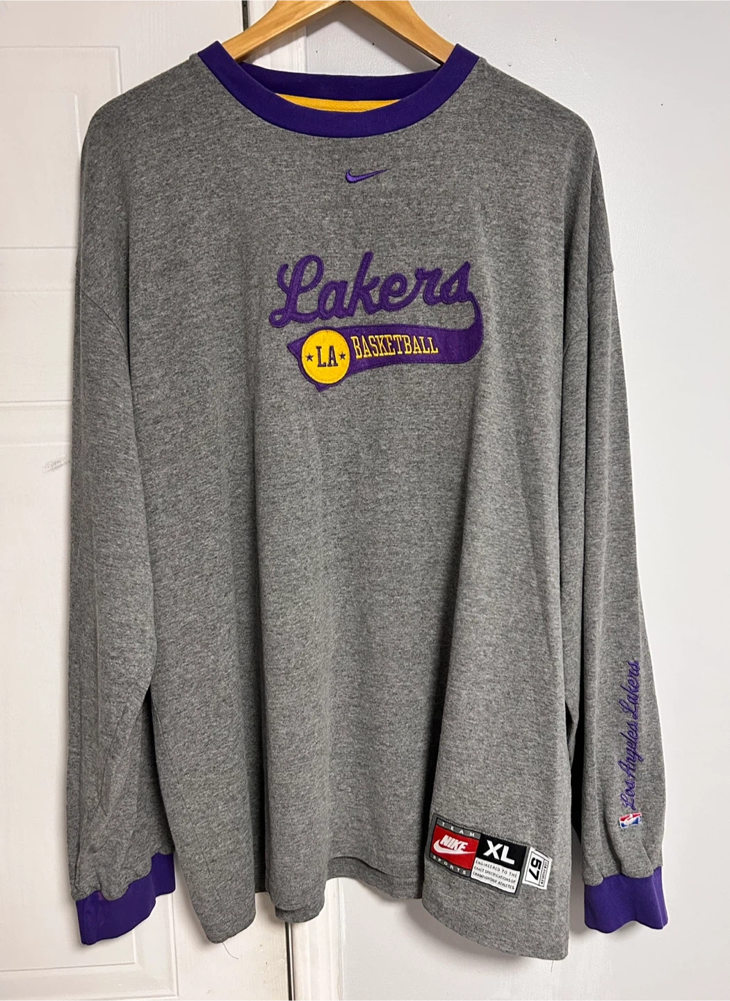 Selling a vintage Nike Los Angeles Lakers long sleeve Mid Swoosh shirt in size XL. It's in great condition and features the Lakers logo and colours. Perfect for any Lakers fan!