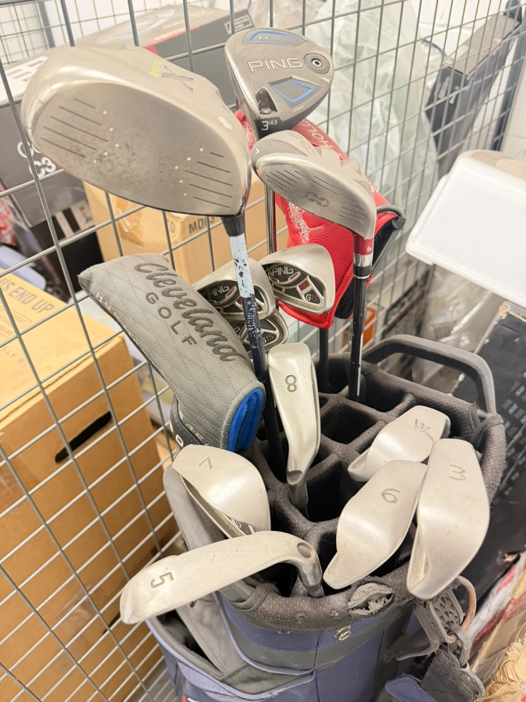 Selling a set of golf clubs including brands like Ping and Cleveland Golf! The set includes various clubs, such as a Ping 3 14.5 and clubs labeled 5, 6, 7, 8, and W.