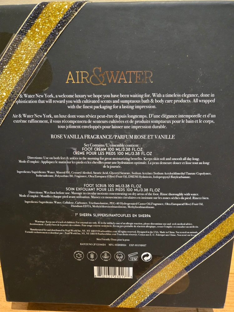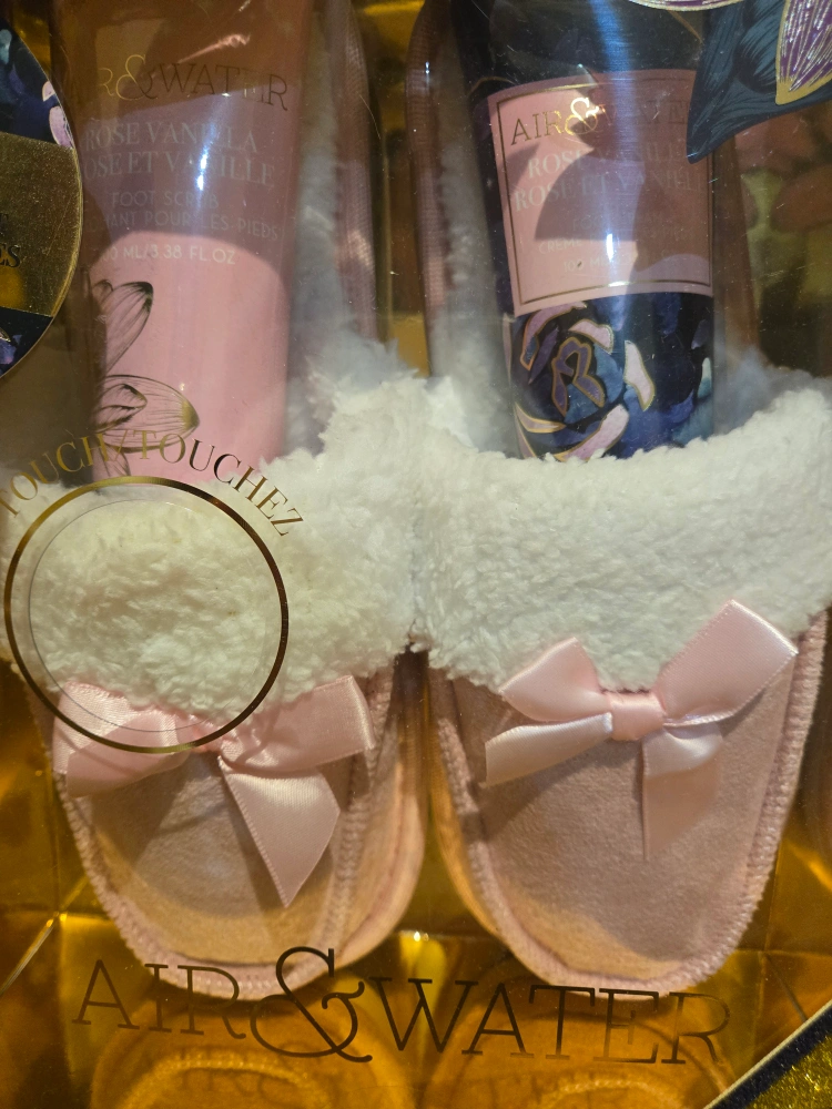 Treat yourself or a loved one with this Air & Water 3-piece sherpa slipper set! It's brand new in the box and includes: - Sherpa slippers - Foot cream (100 ml / 3.38 fl oz) with rose vanilla fragrance - Foot scrub (100 ml / 3.38 fl oz) The expiration date is 2027 September 03