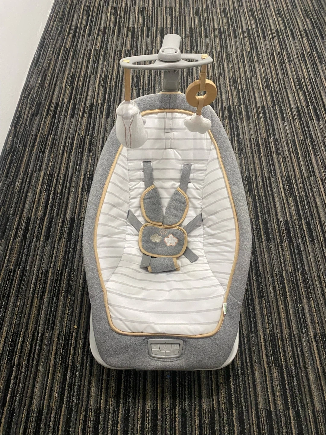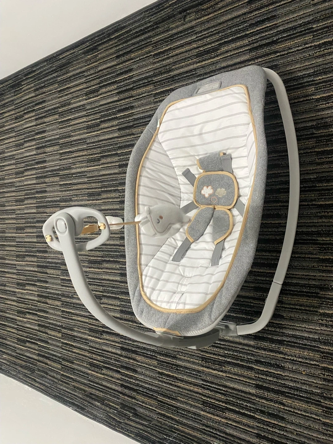 Selling a gently used baby bouncer in great condition! It features a soft, striped fabric and a cute mobile with hanging toys to keep your little one entertained. Perfect for newborns up to a few months old, providing a safe and comfy spot for them to relax or play