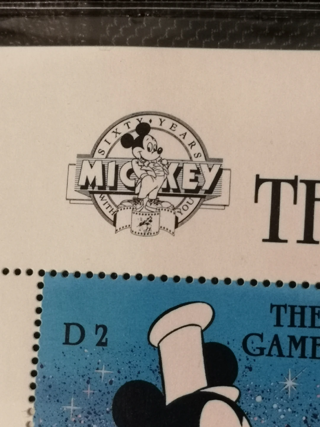 Individual stamps within the sheet depict Mickey from specific years: 1928, 1931, 1936, 1947, 1955, 1940, 1960, 1976 + 1988.