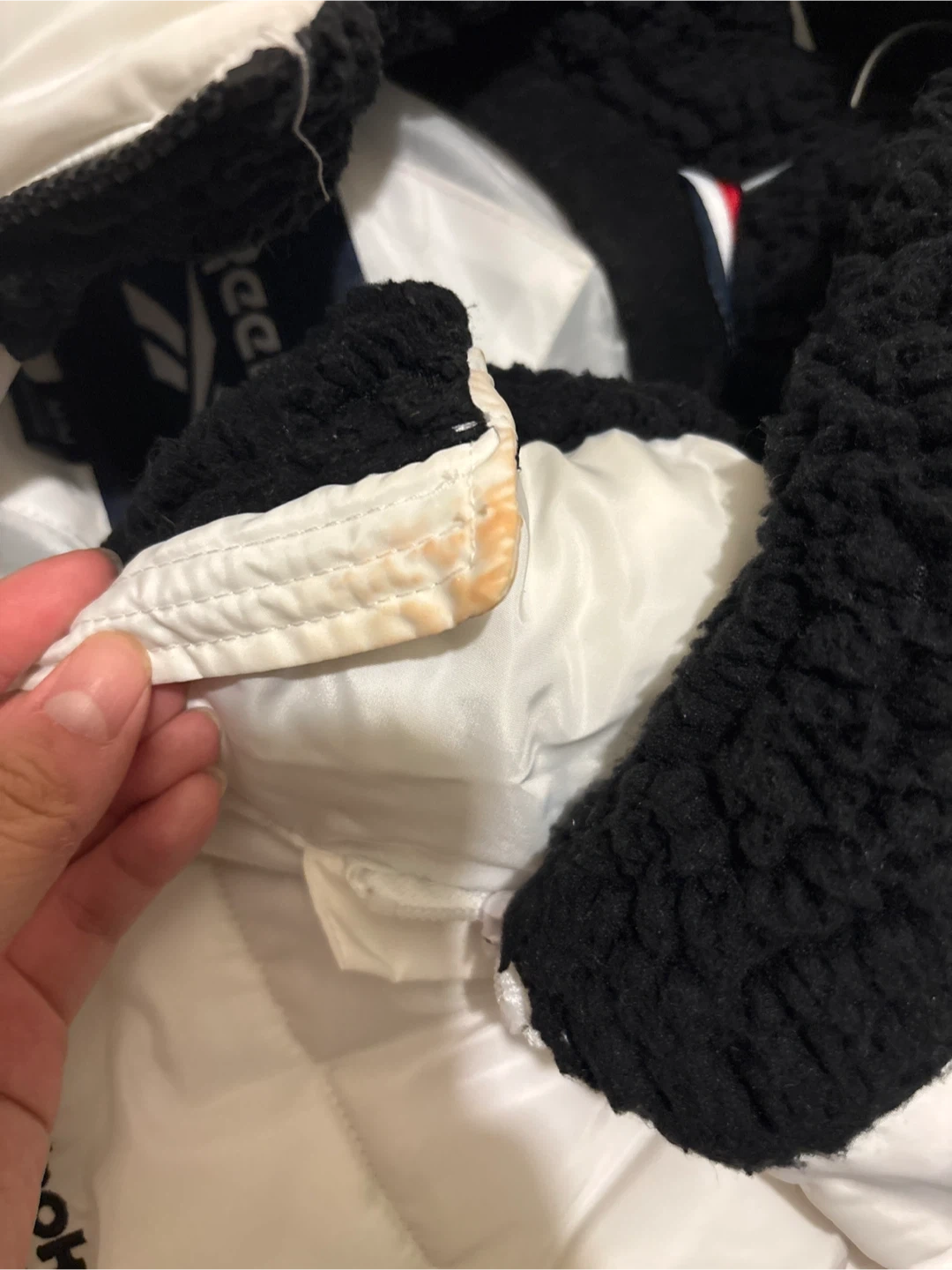Selling a Reebok white puffer jacket. It has some staining on the inside of the collar, as shown in the first photo. Can be washed, cause it's just some makeup. Otherwise, it's in good condition! Only wear for 2-3 times