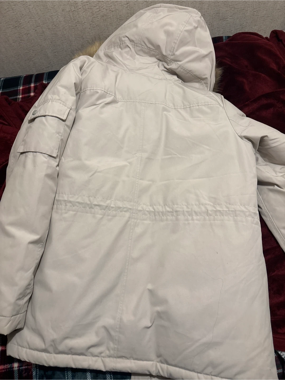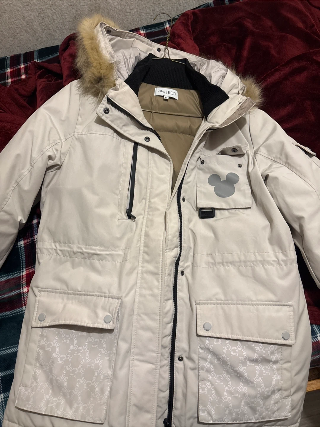 Cream-colored winter parka from Disney BOO. It features a hood with faux fur trim and a Mickey Mouse design on the pocket. Perfect for staying warm and stylish this winter! Only wear for 2-3 times