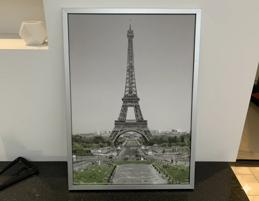 Elevate your space with this vintage IKEA VILSHULT framed art piece, featuring the world-famous Eiffel Tower. A refined black-and-white Paris scene with subtle color accents, set in a sleek silver frame. This rare, discontinued artwork brings timeless elegance and a cosmopolitan touch to any interior.