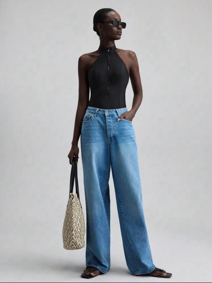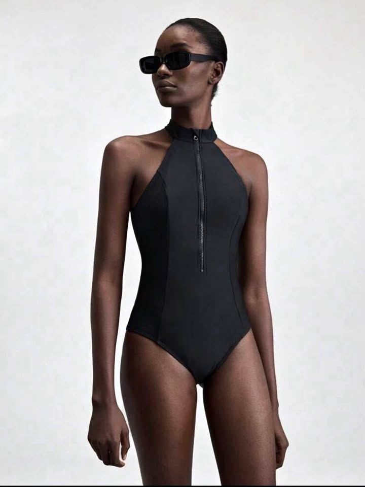 New high mock neck ladies black swimsuit with zip up front size XL. New unworn with panty protector still on.