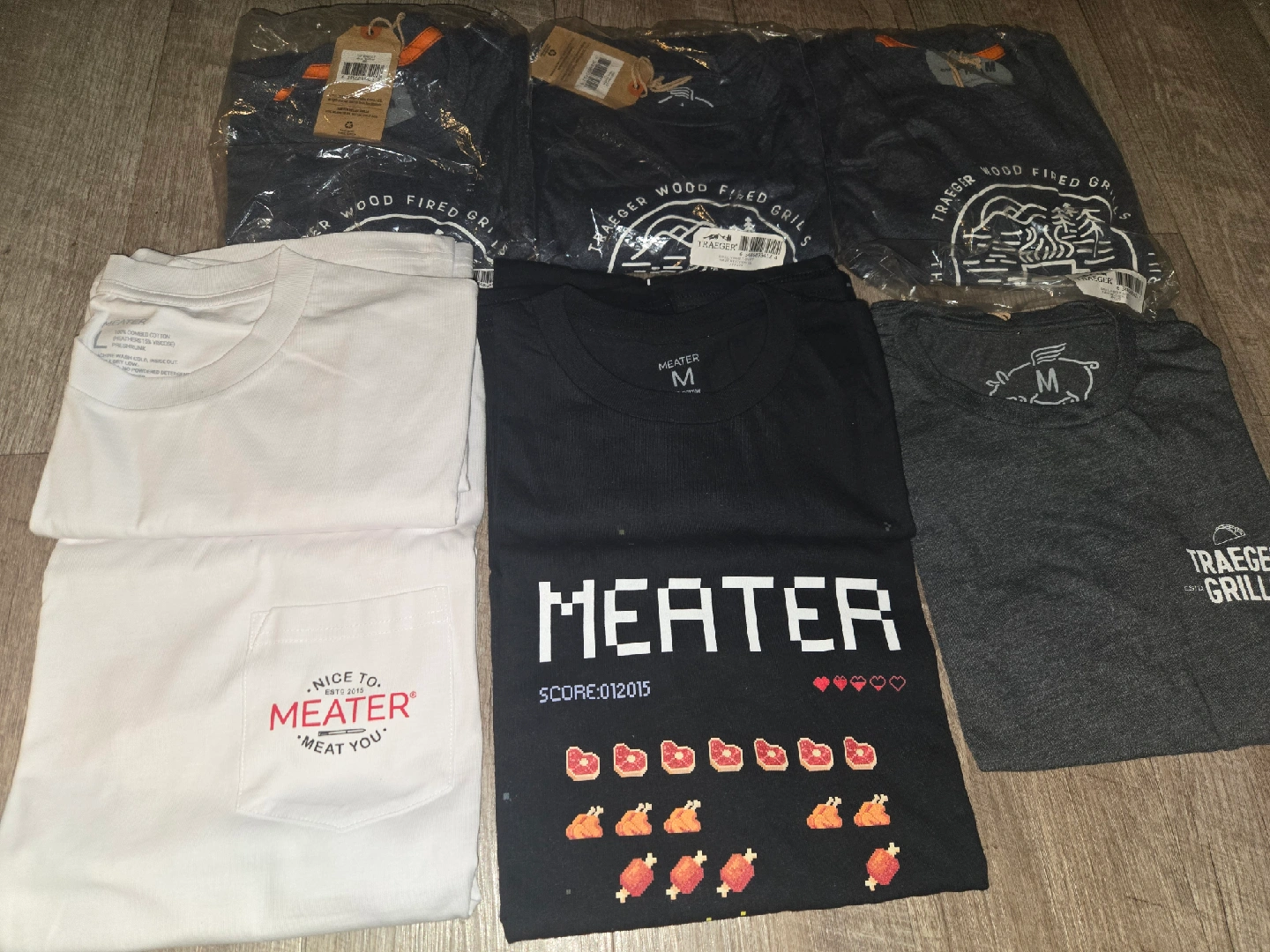Selling a bunch of brand new t-shirts! Included are MEATER and Traeger Grill branded shirts. Varying sizes (M & L available while supplies last). Great for BBQ enthusiasts! Pickup only.