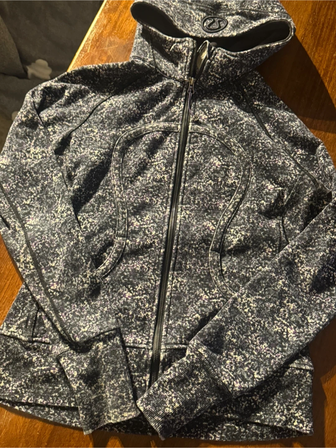 Selling a Lululemon Scuba Hoodie in a size 4. The hoodie is grey with a unique speckled pattern. It's in great condition and perfect for workouts or just lounging around. Has a full zipper and a comfortable hood.