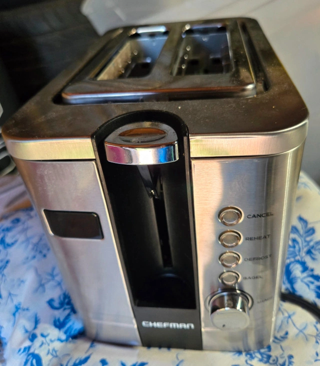 A sleek and reliable 2-slice toaster from Chefman, featuring a brushed stainless steel design and four handy functions: Cancel, Reheat, Defrost, and Bagel. The extra-wide slots can handle thick slices or bagels with ease. Works well and is easy to clean with a slide-out crumb tray. Key Features: 2-slice capacity with extra-wide slots Bagel, Defrost, Reheat, and Cancel functions Stainless steel body with modern design Adjustable browning control knob Slide-out bottom tray for easy cleaning