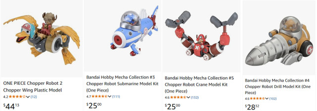 This is a complete set of Bandai's One Piece Chopper Robo Series kits. Each unique Chopper robot (5 total) transforms into a vehicle and comes with a mini Tony Tony Chopper figure. All five can be combined to create the giant mecha form. A great collector’s item for One Piece and Chopper fans, especially rare as a full set in assembled condition. Key Features: Includes all 5 Chopper Robo vehicles (Air, Marine, Drill, Heavy Lifter, and Guard Tank types) Each comes with a small Chopper pilot figure Combine all to create Giant Chopper Robo Assembled and displayed only, excellent condition Original Bandai release Get an additional $2 discount for each additional item purchased from my listing. For example, buy 2 items, get $2 off; buy 3 items, get $4 off, and so on!