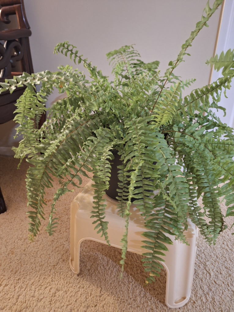 Boston fern in simple black pot. Fern is known for filtering airborne pollutants like formaldehyde, benzene, and xylene, which can come from common household items.