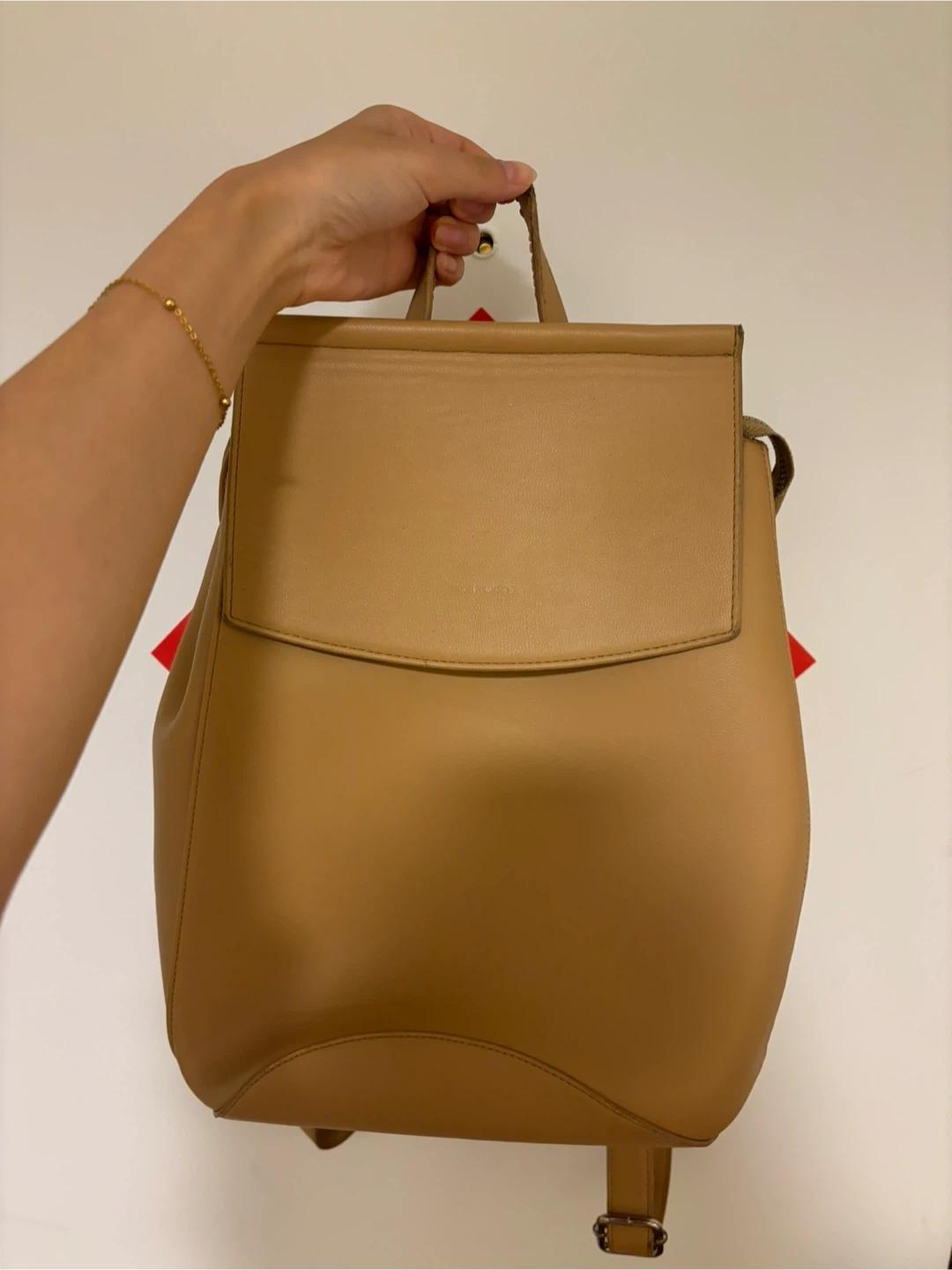 This is a Piximood tan backpack. It has some signs of wear on the straps and zipper, as shown in the photos. Still lots of life left in it