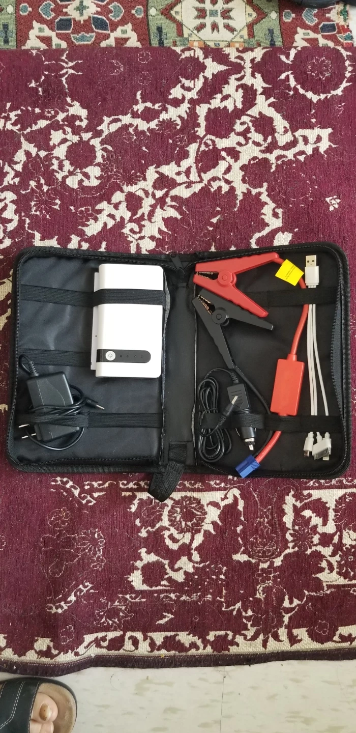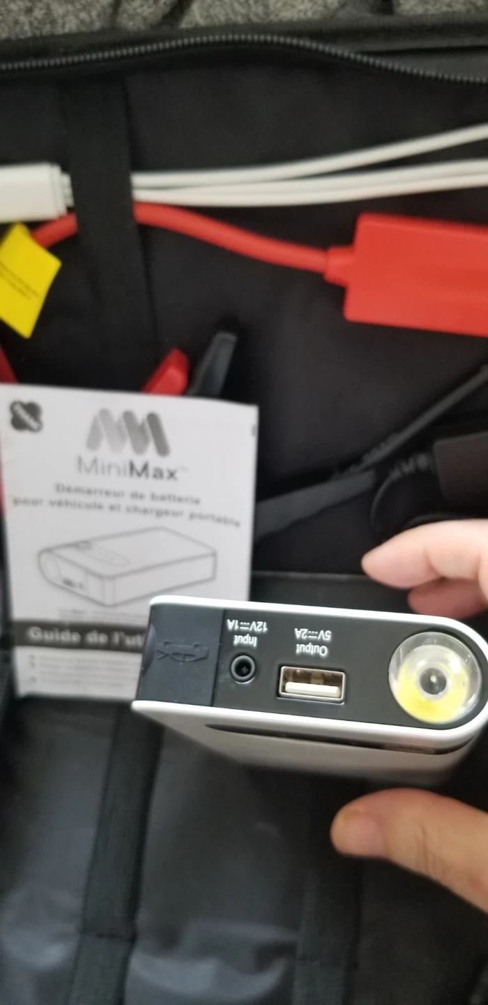 MiniMax portable jump starter kit is great for vehicles and charging. It includes jumper cables, a wall adapter, and a car charger. The unit has an integrated LED flashlight for convenience.
