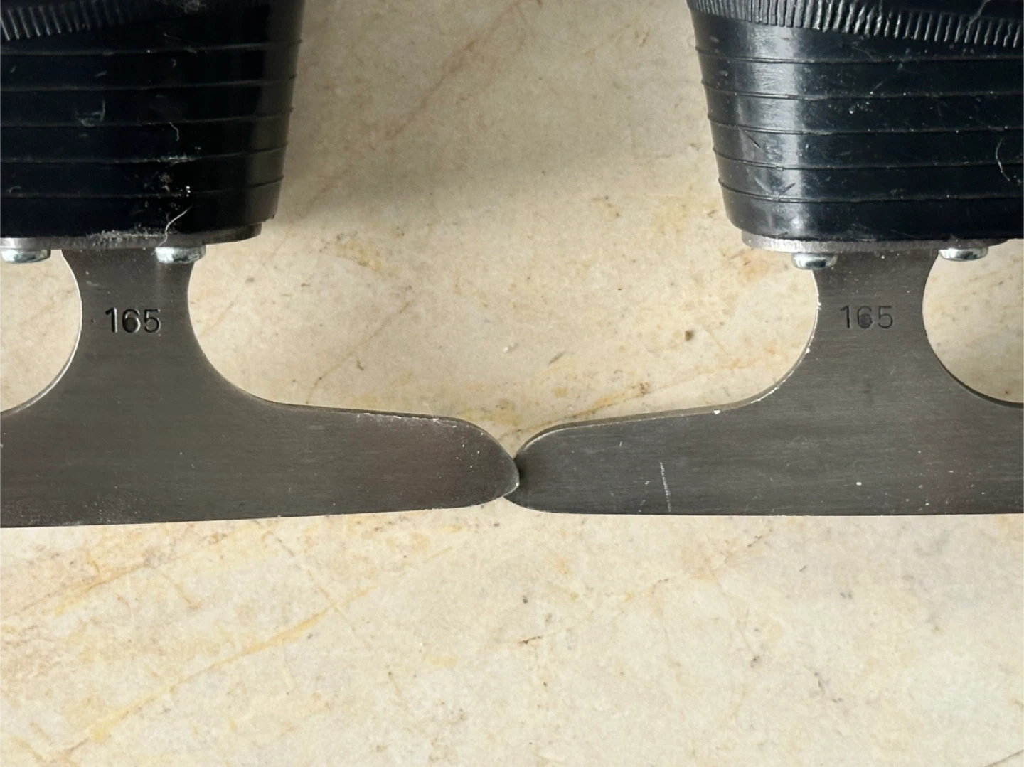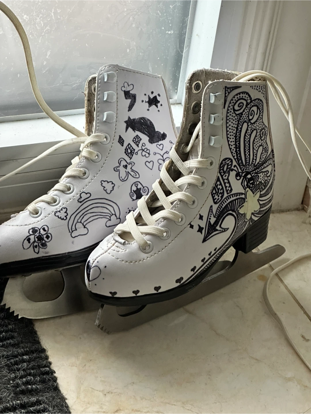 Girls White figure skates with unique hand-drawn designs featuring rainbows, butterflies, and a cute alien character. Blade size marked as 165.