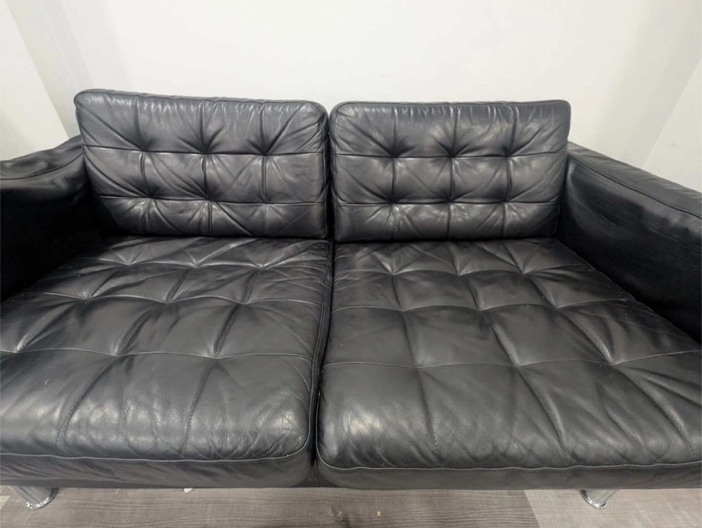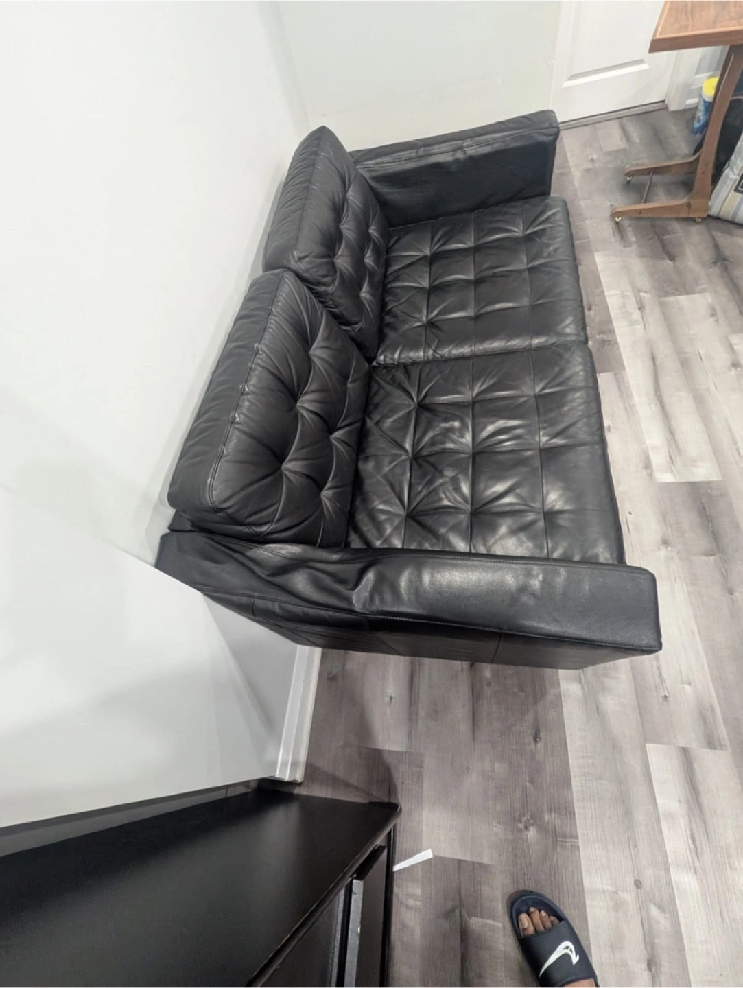 Selling a comfy black leather sofa! It's a stylish piece that would look great in any living room. The leather is in good condition, and the cushions are nice and plush. Perfect for relaxing after a long day