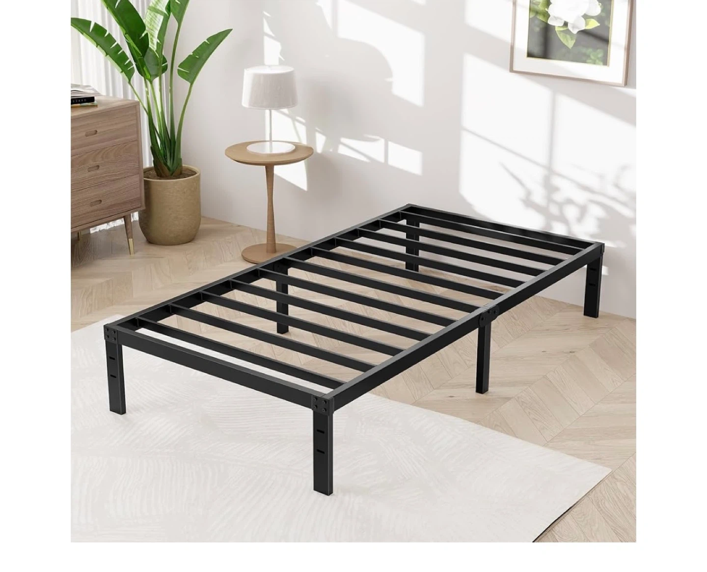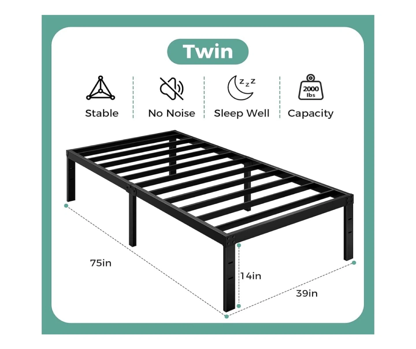 177Selling a twin size metal bed frame in black. It's stable, doesn't make noise, and helps you sleep well. The dimensions are: - 75 inches long - 39 inches wide - 14 inches high It also provides powerful storage space underneath, about 13 inches high. No box spring is needed!