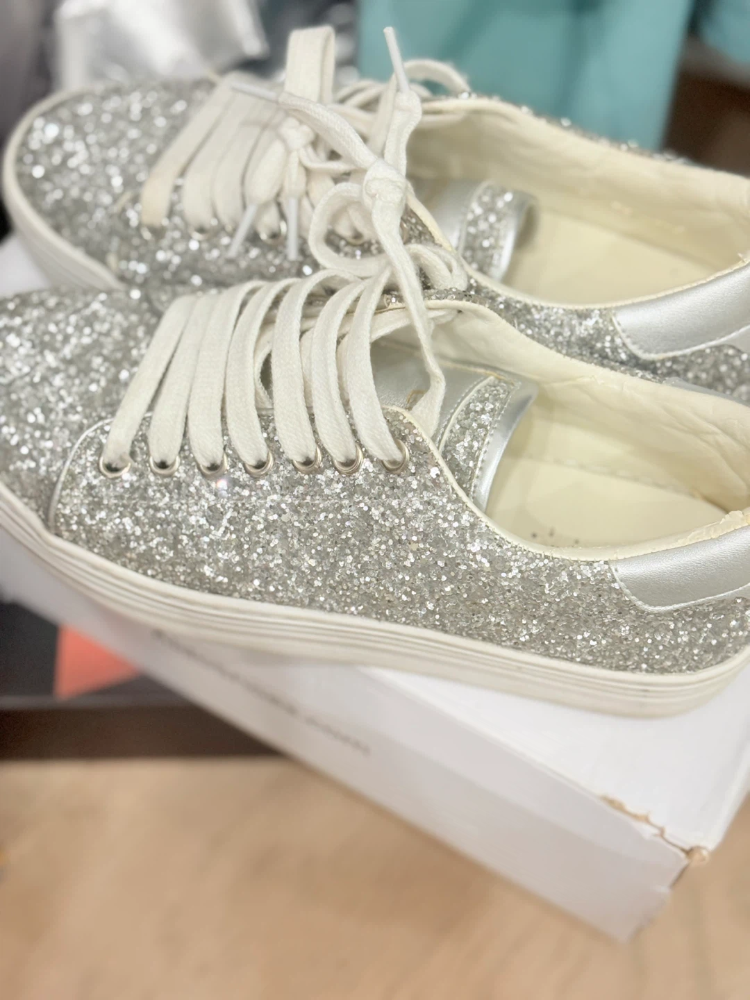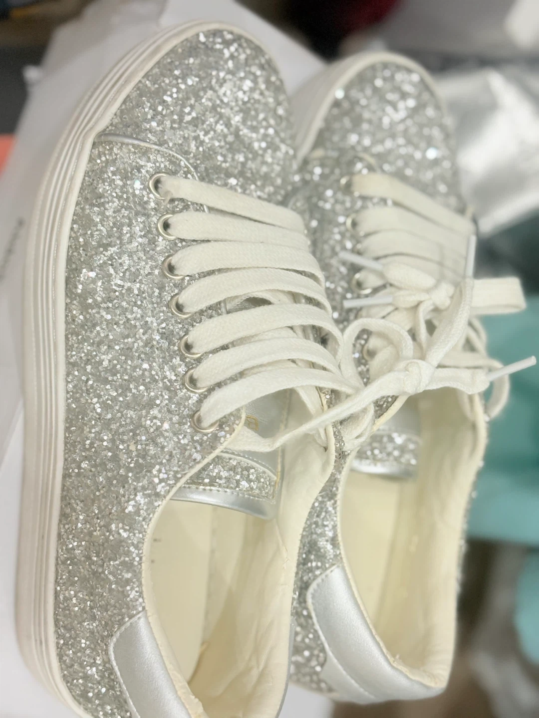 Selling a pair of glittery silver sneakers! They're super sparkly and fun. Perfect for adding a bit of bling to your outfit