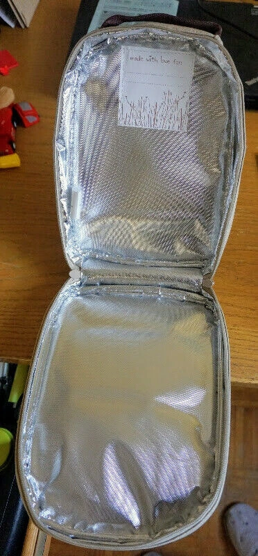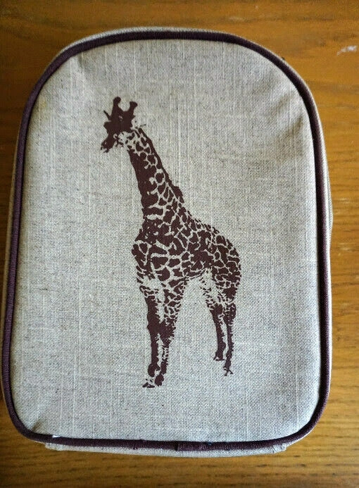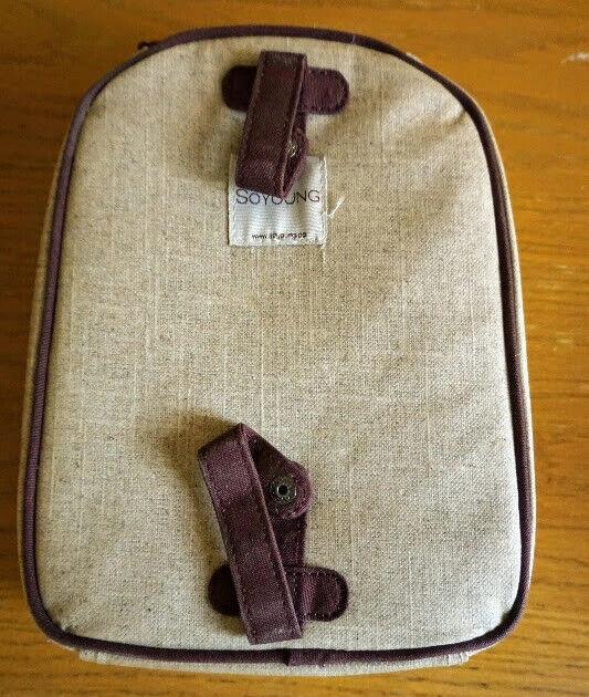 10Brand new, never used SoYoung "Toddler backpack" lunchbag. Can be snap-tied to another bag. Raw linen, brown giraffe on beige background. Upright positioning allows for sippy cup and snack containers. Detachable snaps allow for easy storage in the fridge. Insulated interior. PVC, Phthalate, Lead and BPA-Free. Dimensions: 8.5"W x 11"H x 3"D. If you see this ad the item is still available.