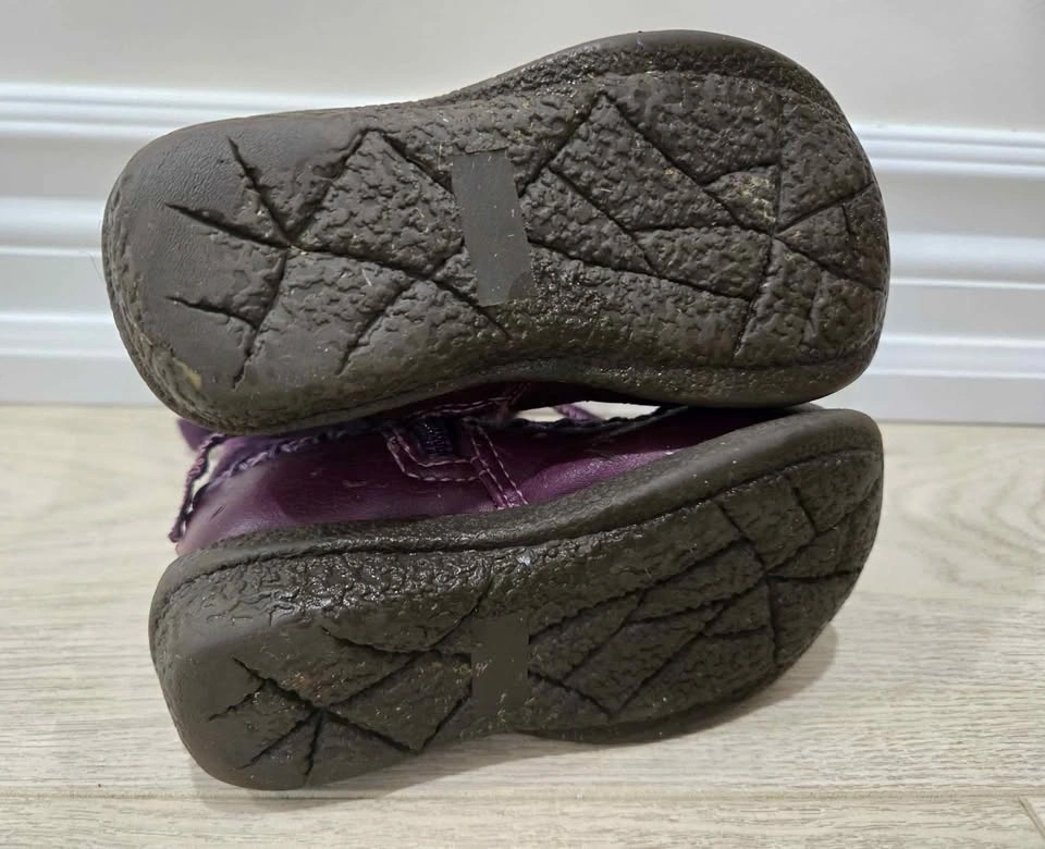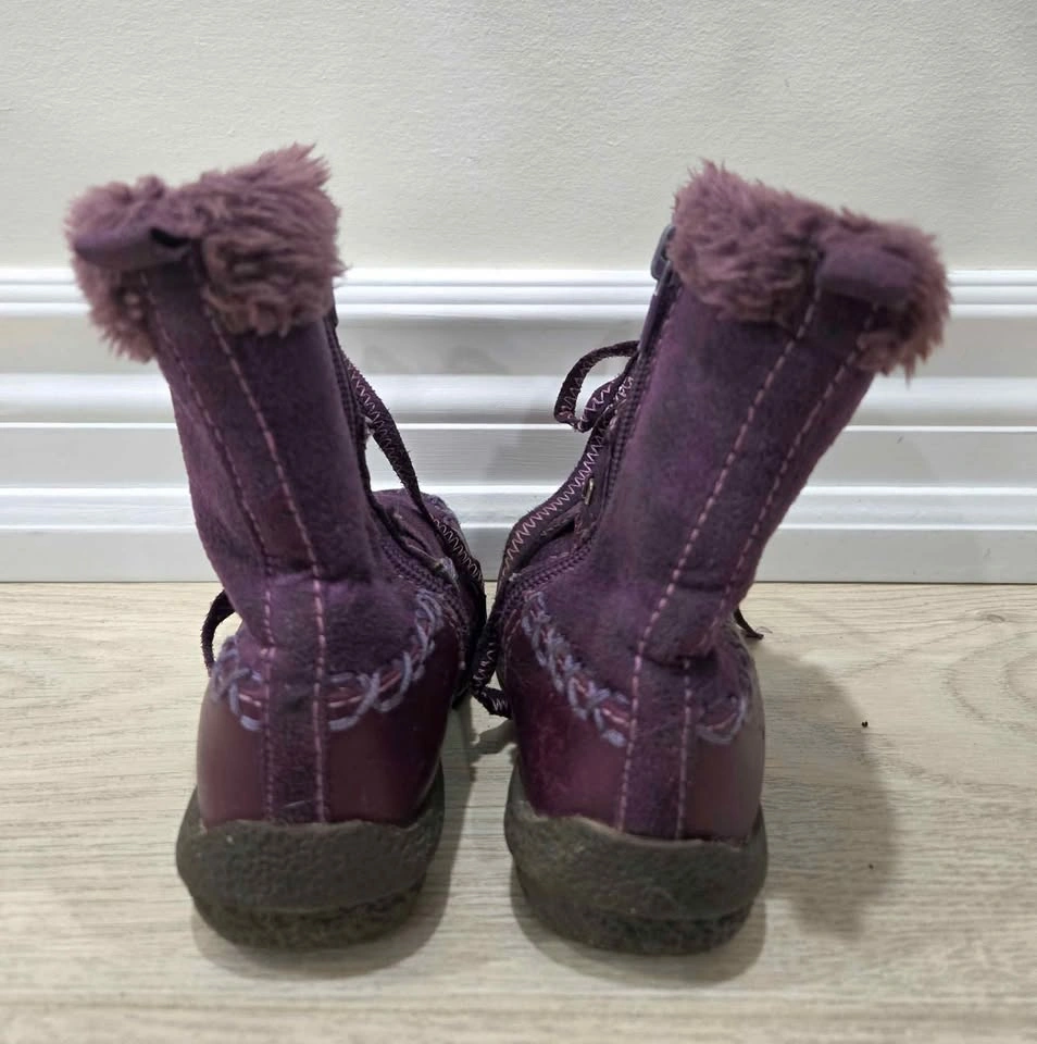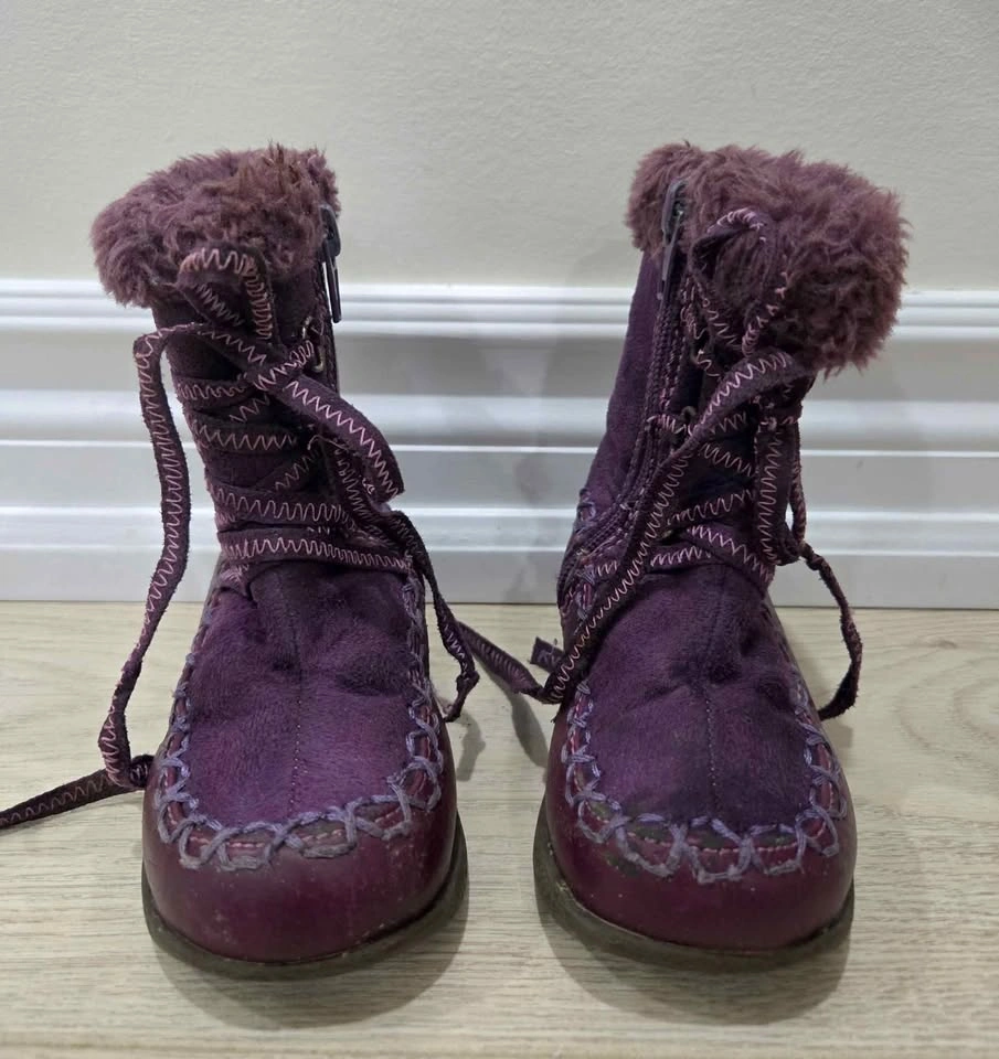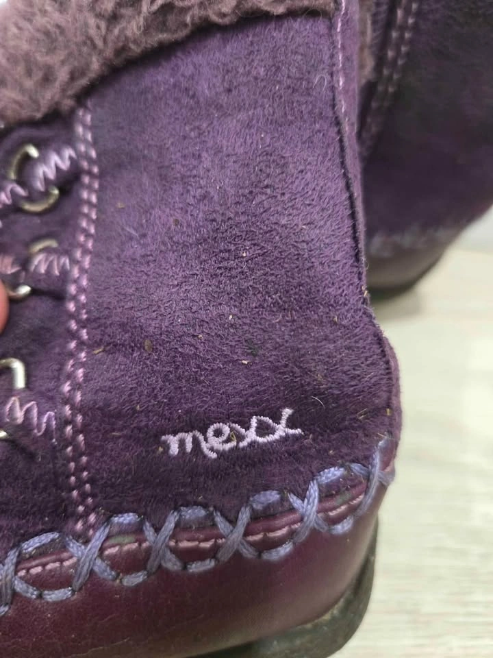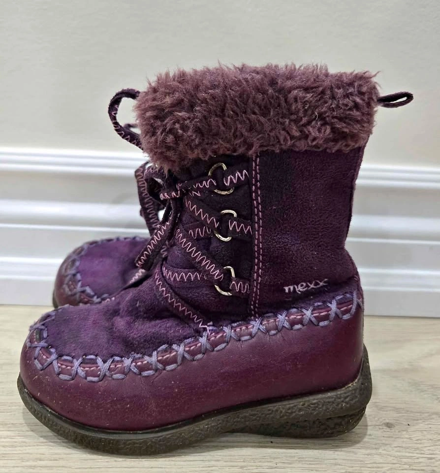 10These are a pair of Mexx purple boots, perfect for keeping your little one's feet warm and stylish during the colder months. These boots feature a faux fur trim and inside zipper (faux lace-up closure). Please note that these boots are used, but they're still in good condition with lots of life left in them. Not able to see a size written anywhere on the boot, but used with 18-24 month old child. Just a friendly heads-up: If you're seeing this ad, the boots are still up for grabs!