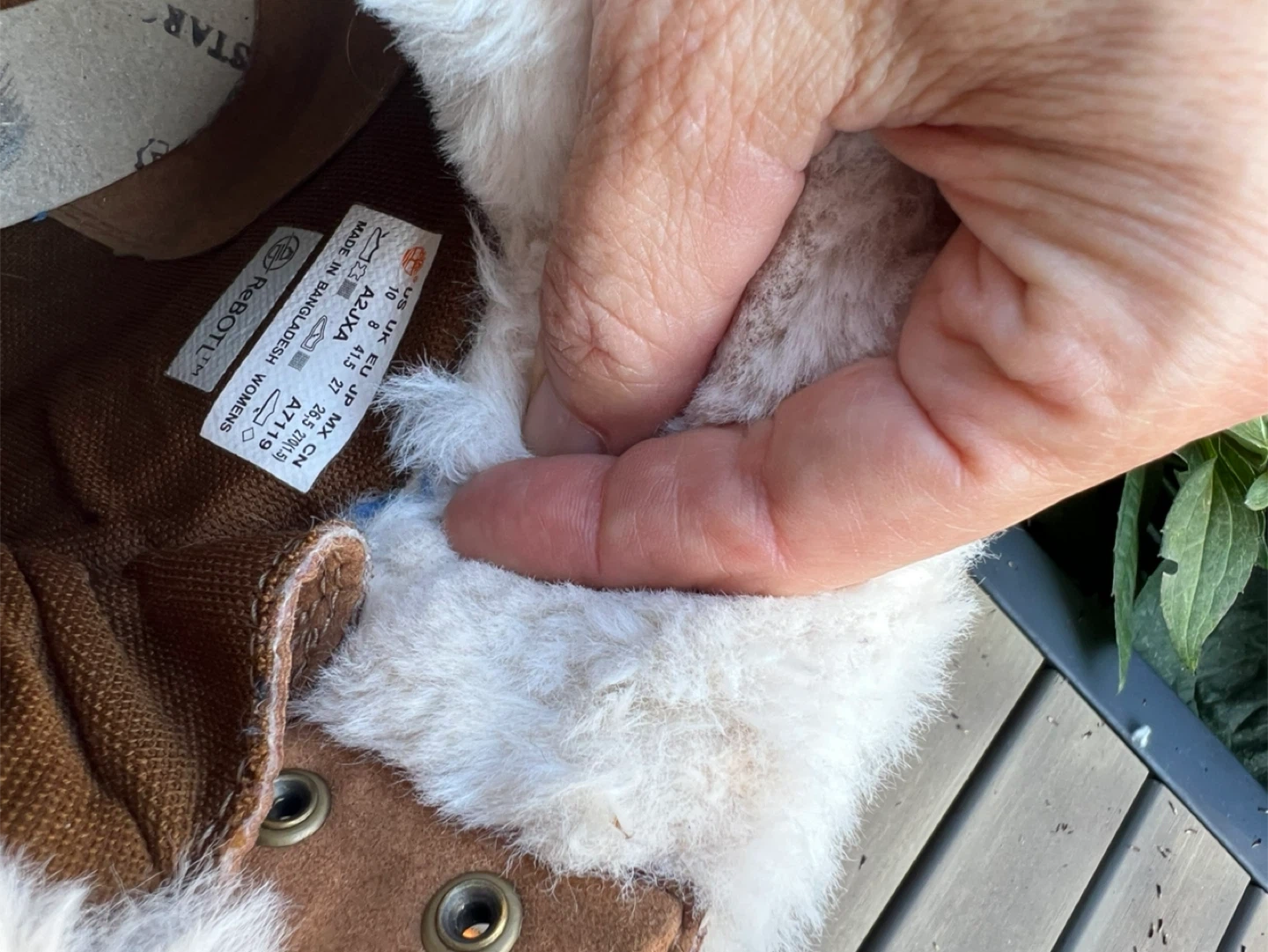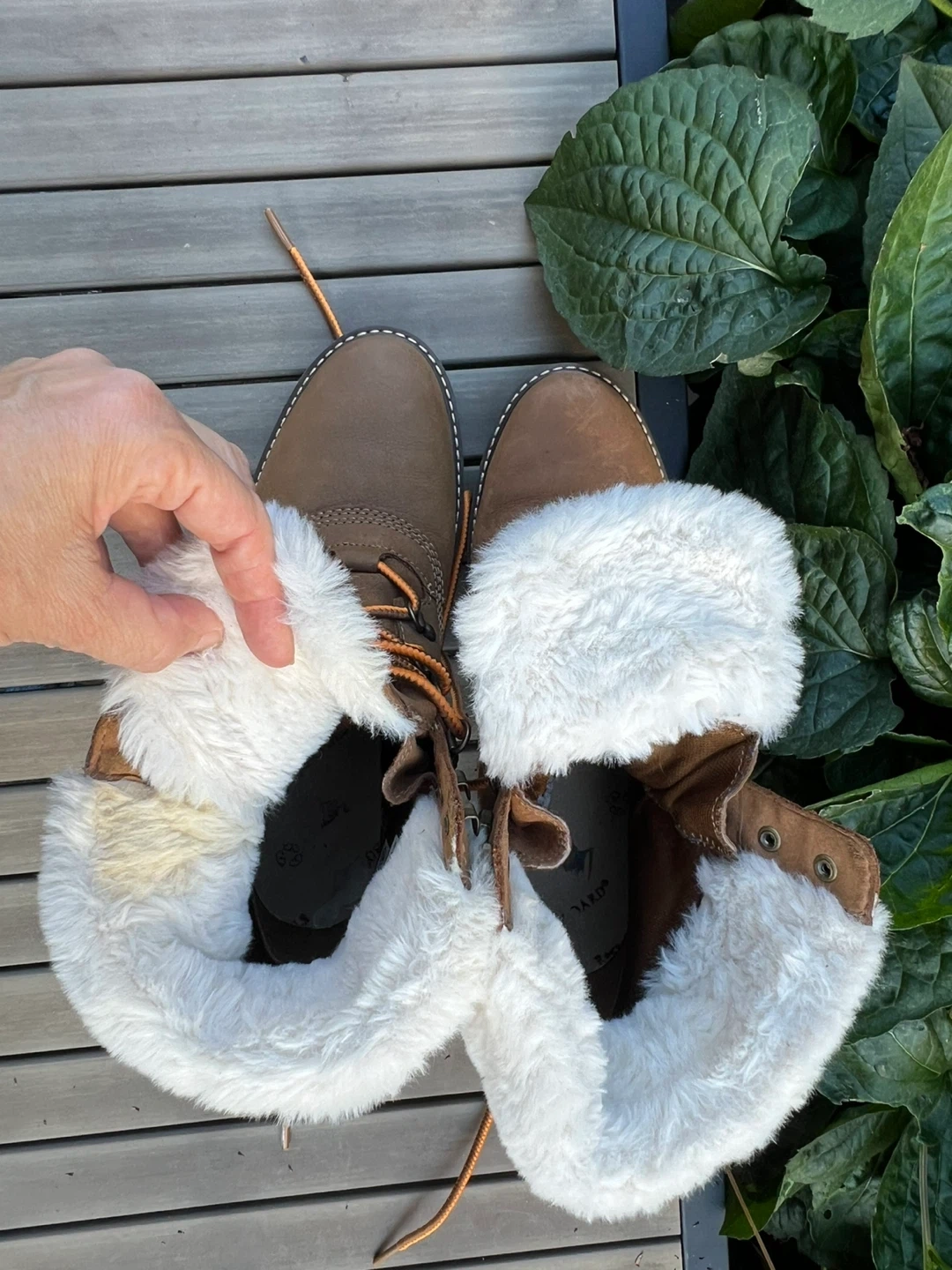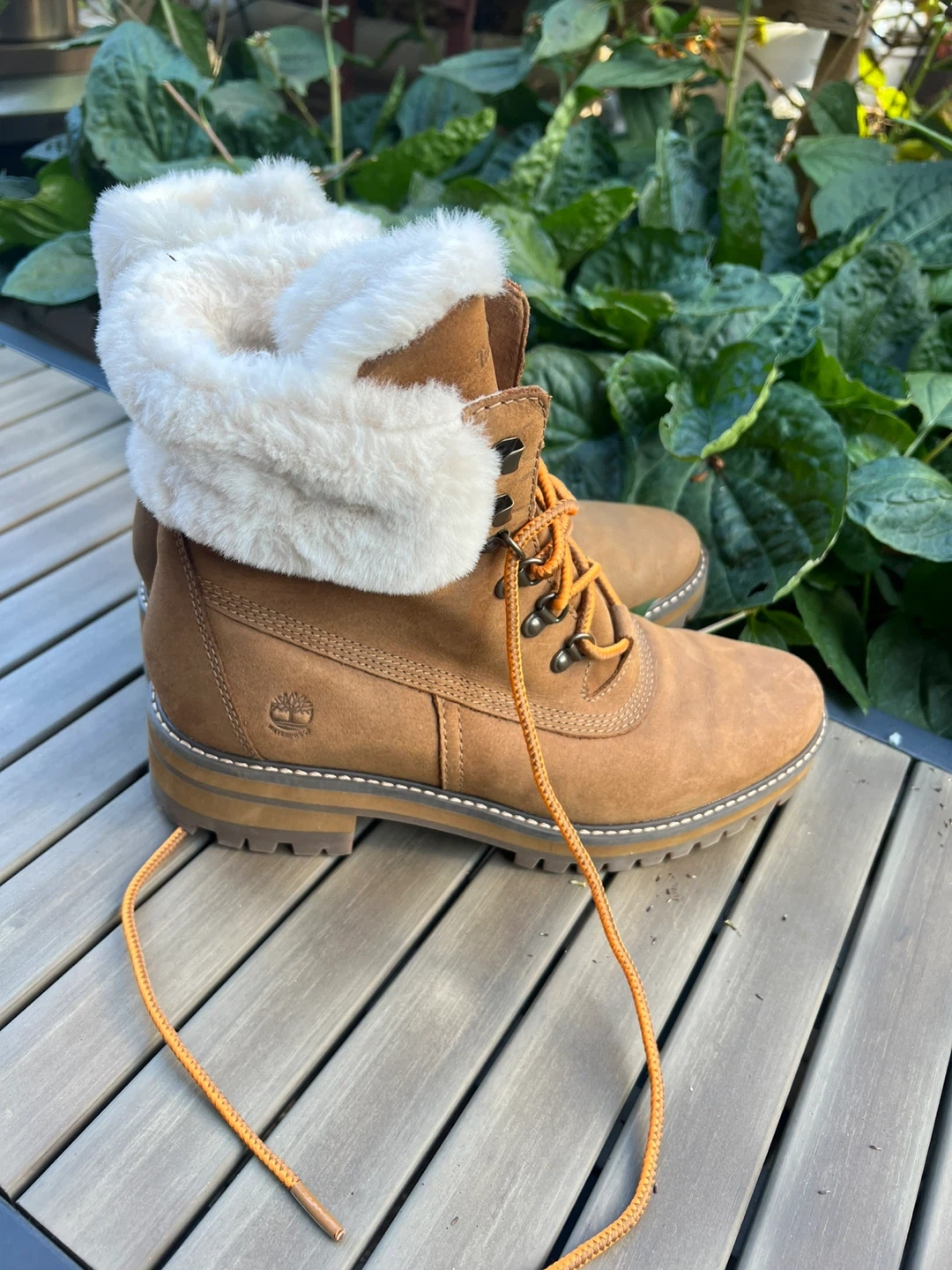 Timberland ReBOTL waterproof shearling boots in a women's size 10. These boots are a stylish and practical choice for colder weather, featuring a waterproof construction and cozy shearling lining. The ReBOTL material also makes them an environmentally conscious choice!