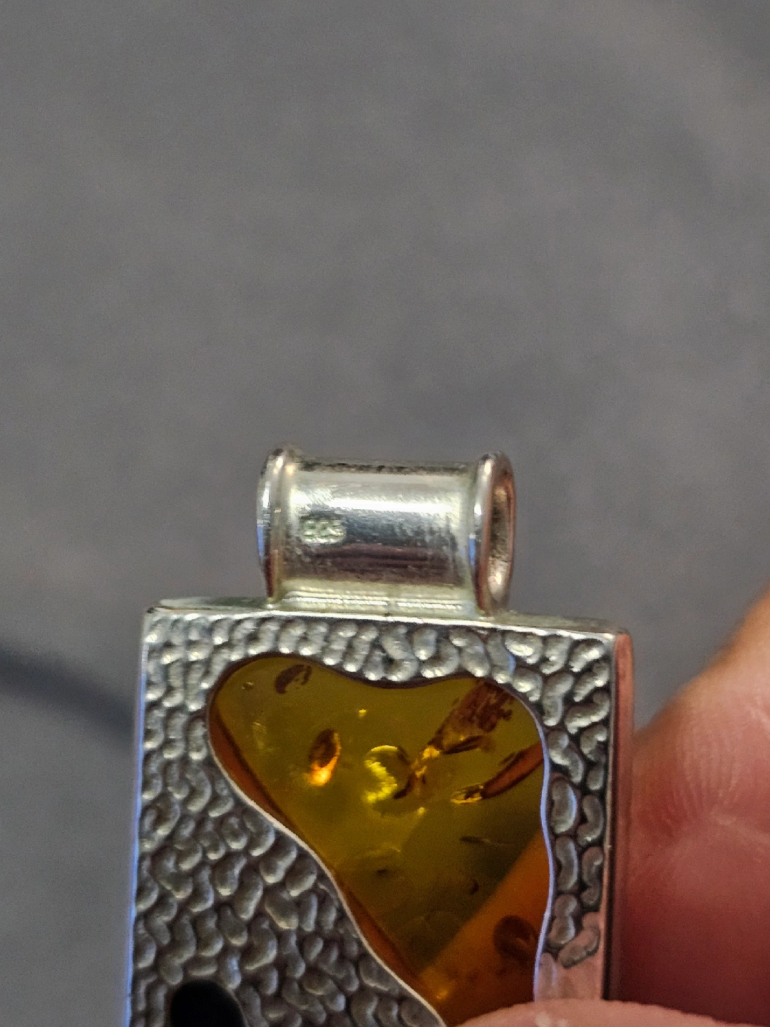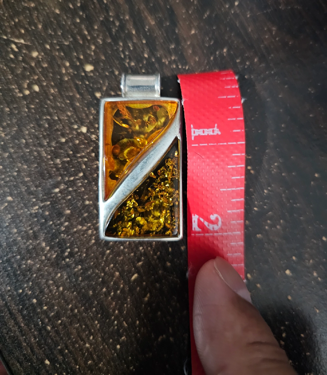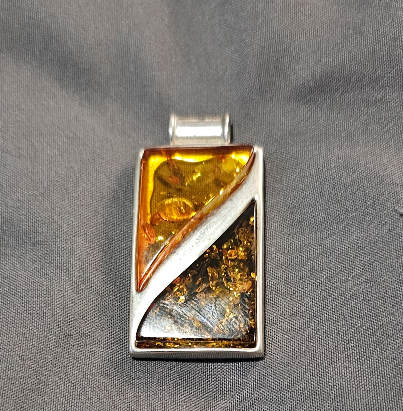 1000+Here's a unique pendant featuring amber and sterling silver! The pendant has a distinctive design with two different shades of amber separated by a sterling silver diagonal line. The back of the pendant is textured, adding to its charm. The pendant measures approximately 2 inches in length, making it a noticeable yet elegant piece