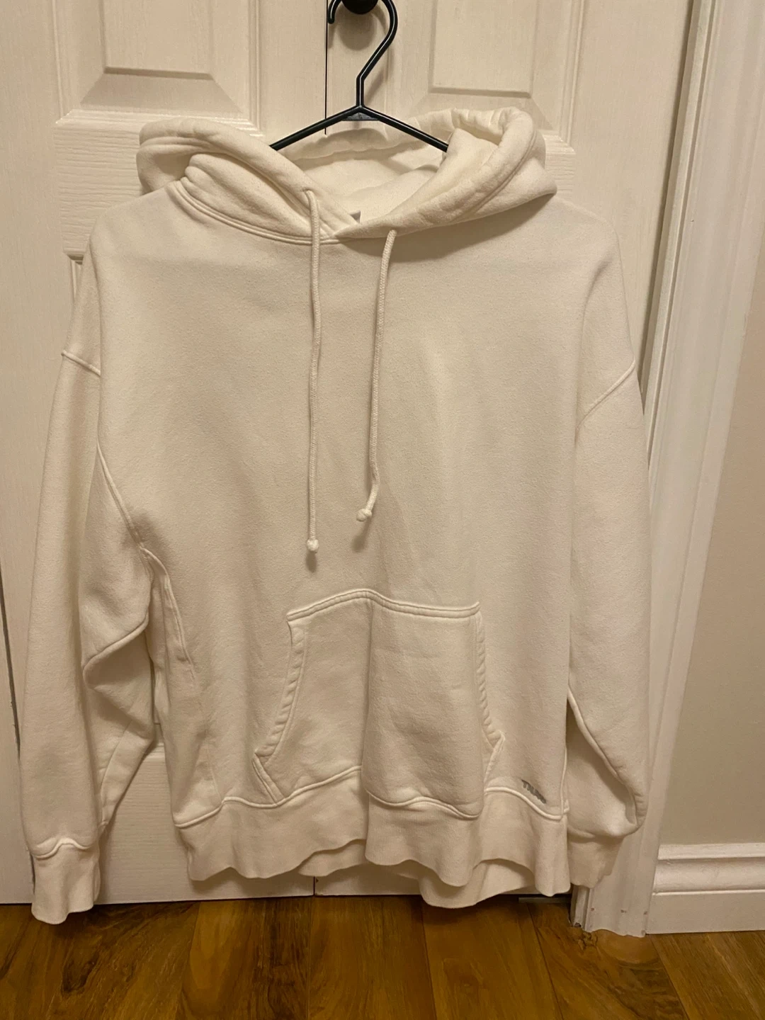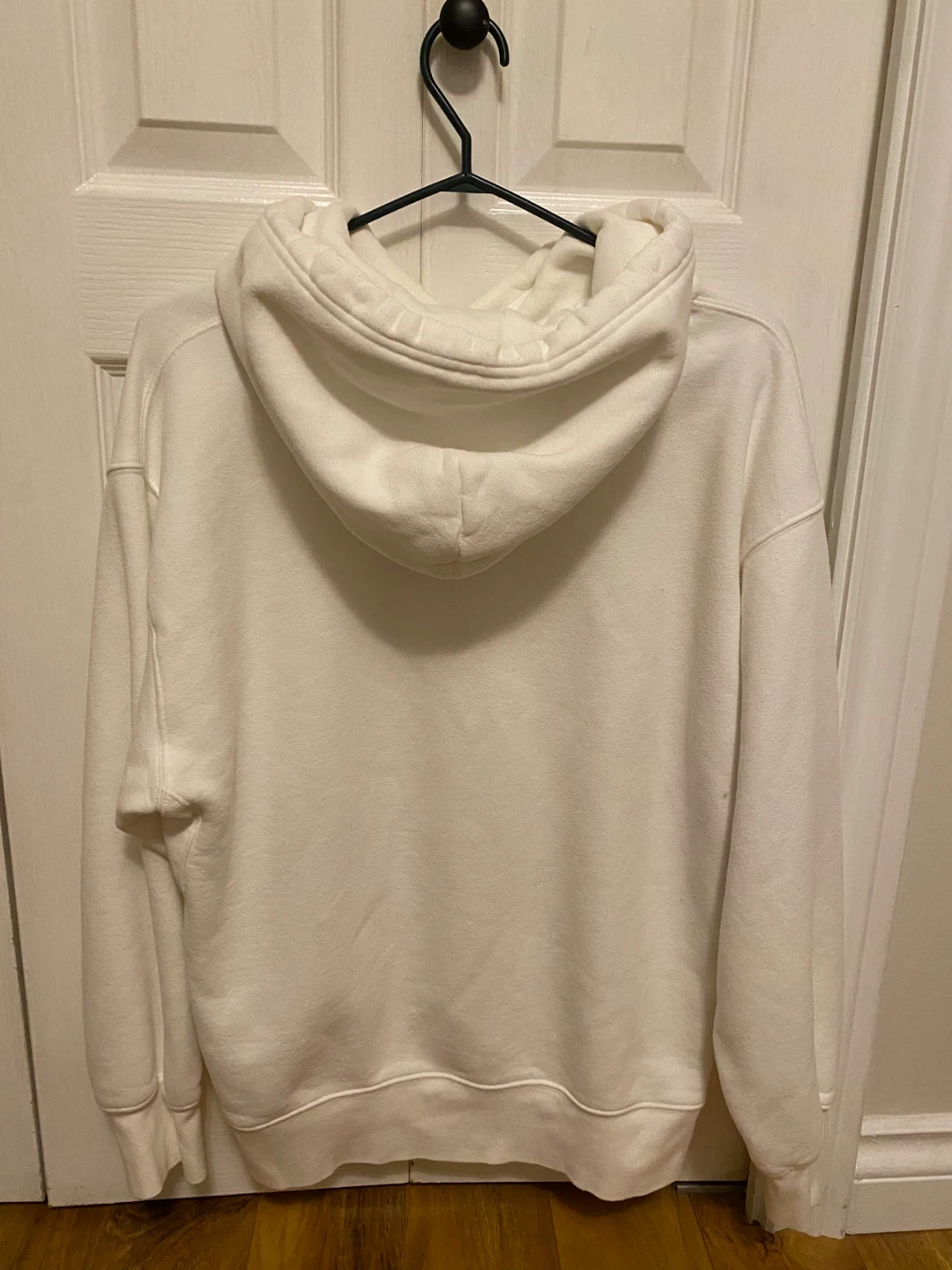 Selling a TNA Sweatfleece Cozy Fleece Boyfriend Fit hoodie in a size small. It's a comfy and relaxed fit, perfect for everyday wear. There’s a small light pink stain near the pocket, but overall it's still in good condition.