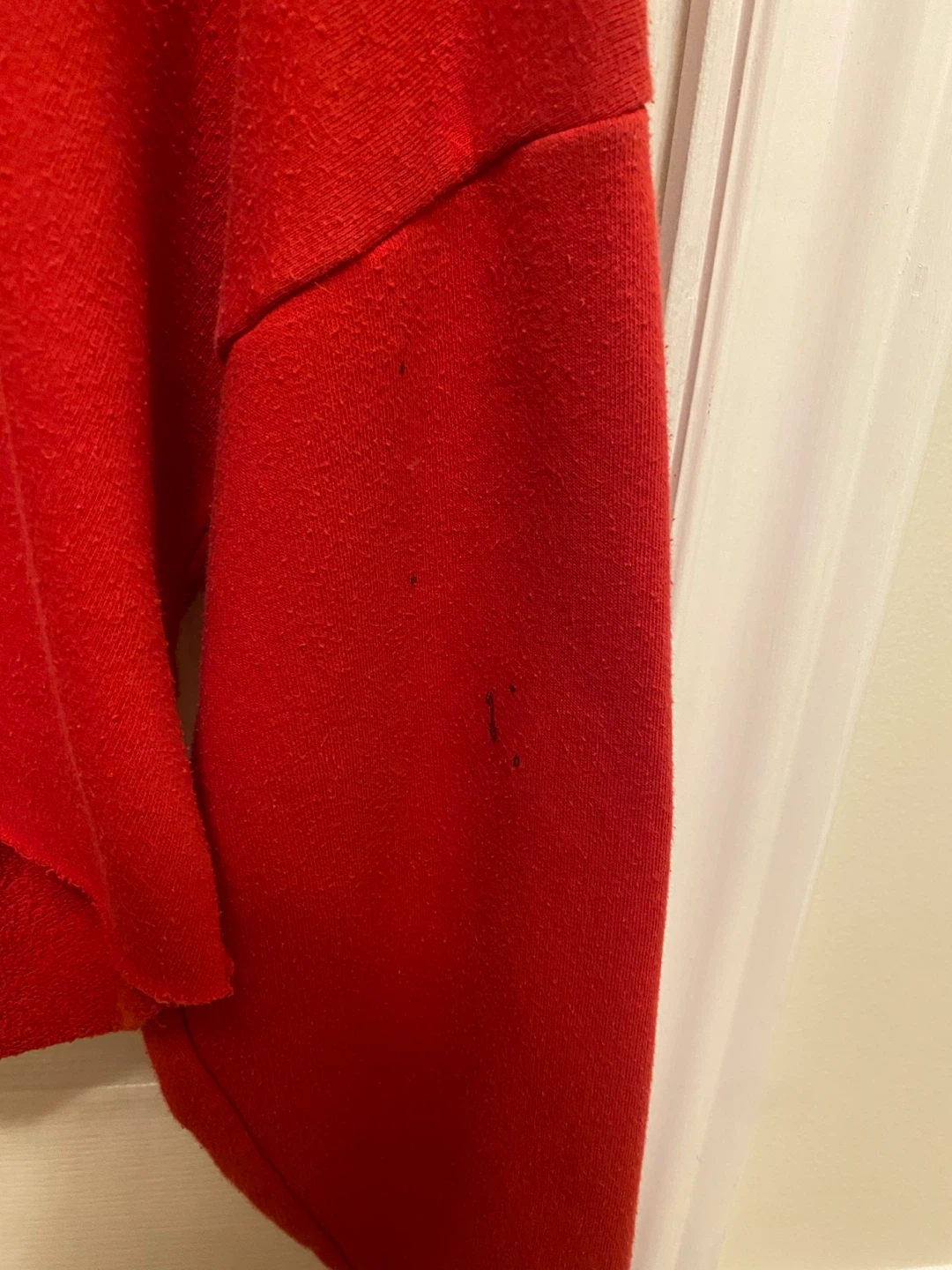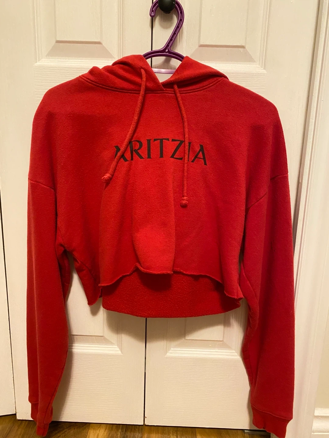 Selling a Tna Aritzia cropped hoodie in a vibrant red colour. It's a size XS. There’s a small light stain near the sleeve, but overall it's still in good condition.