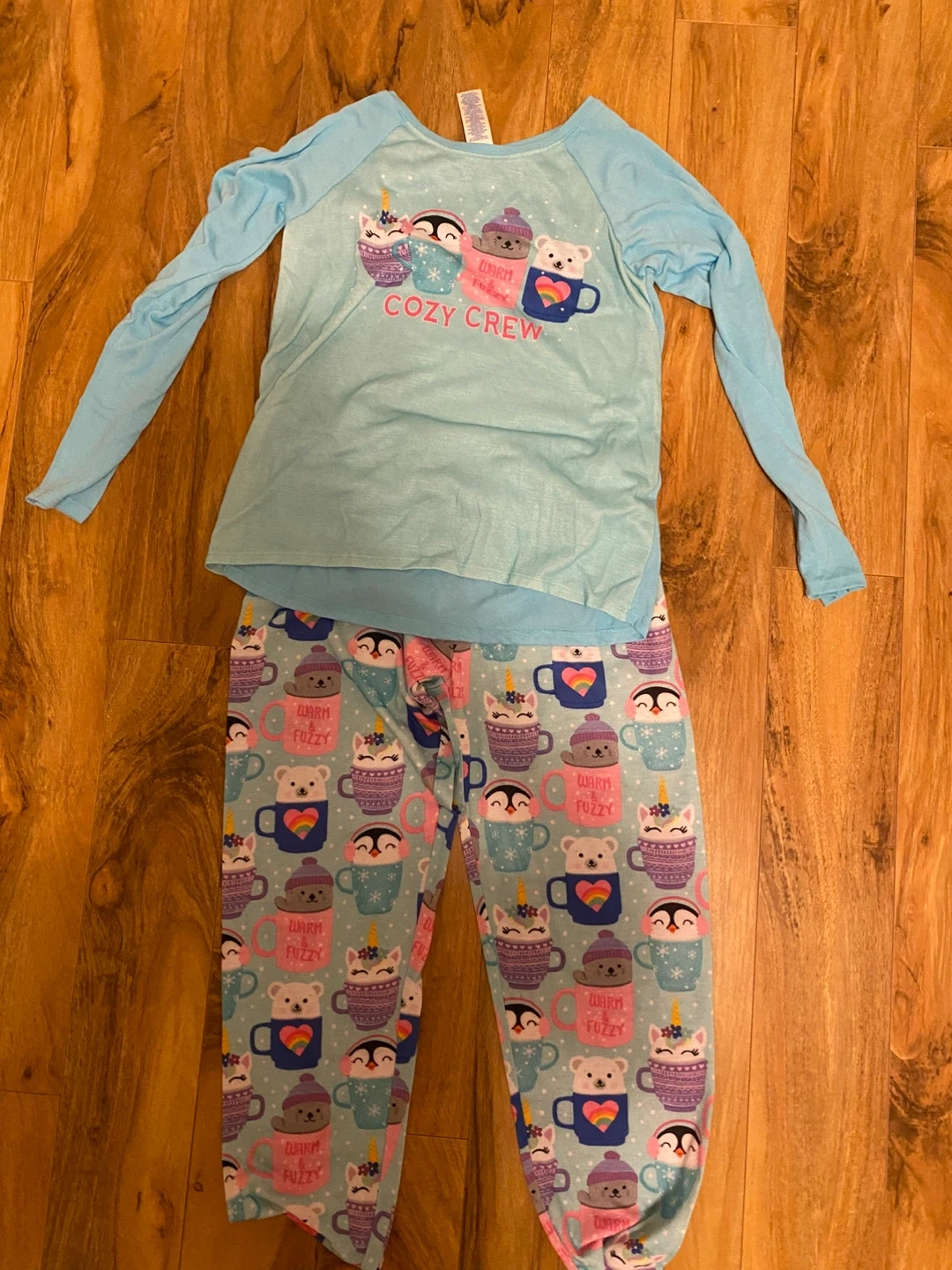 Cozy pajama set from The Children's Place in size XL (14). Features a cute pattern with mugs, penguins, bears and unicorns. Made of 100% polyester, so it's soft and comfy for a good night's sleep