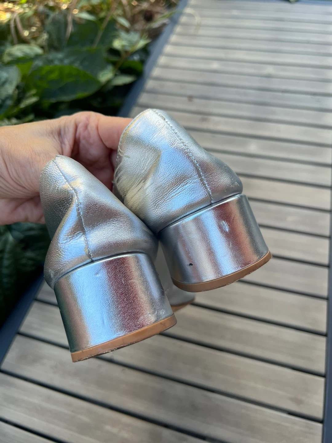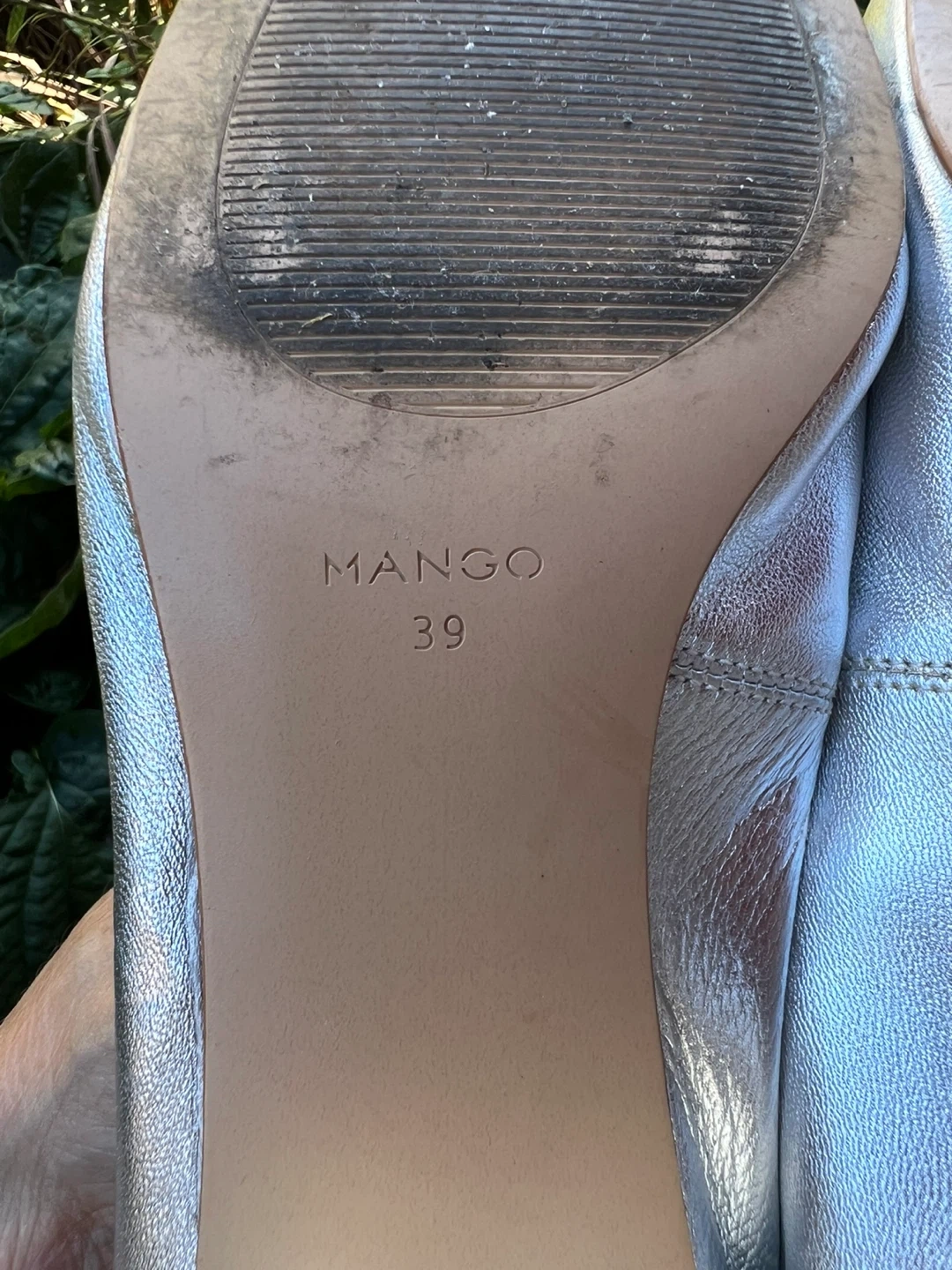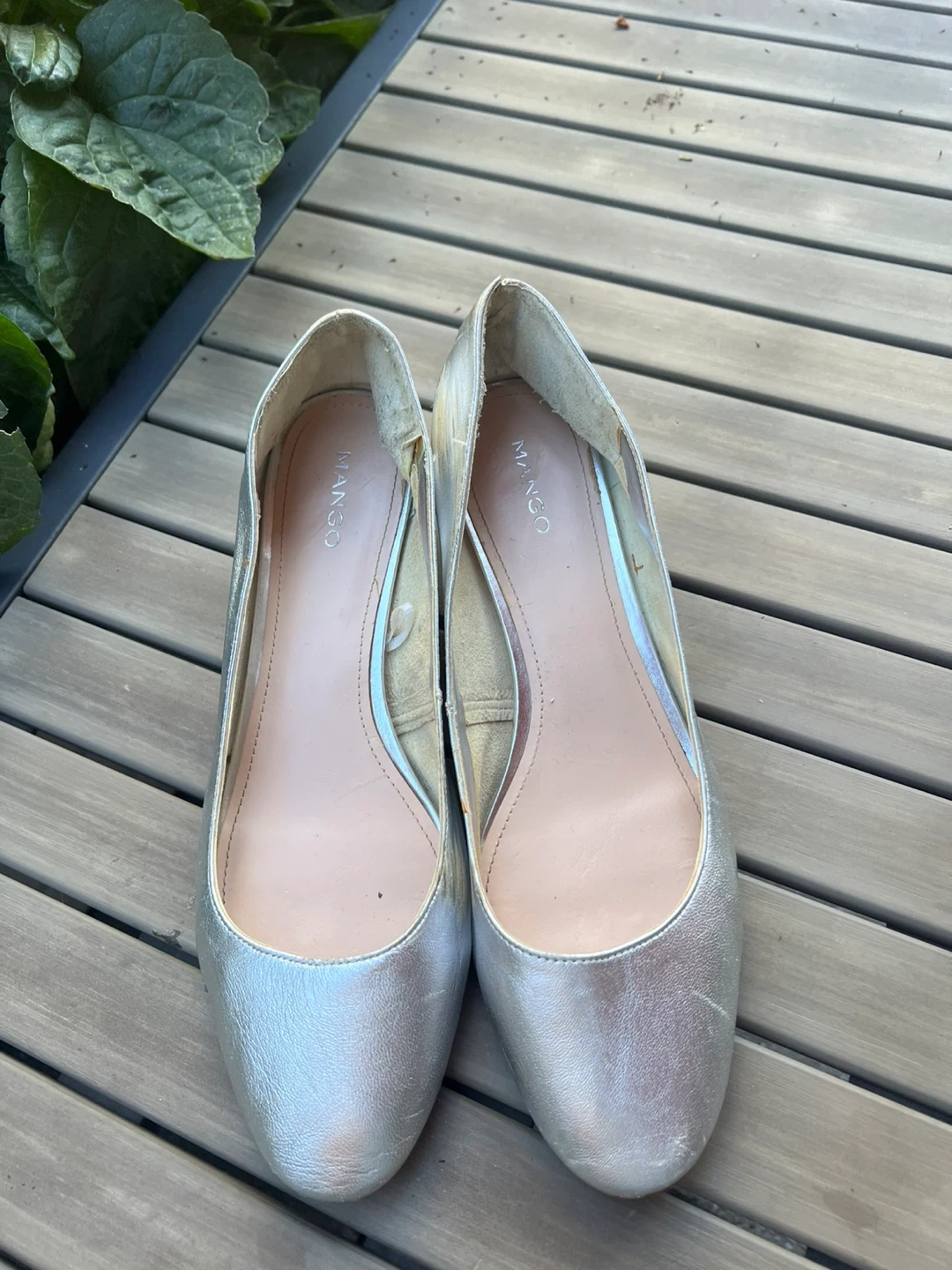 Selling a pair of Mango silver leather block heel pumps. These are a European size 39, which is approximately a US size 8.5-9 They are in fair condition