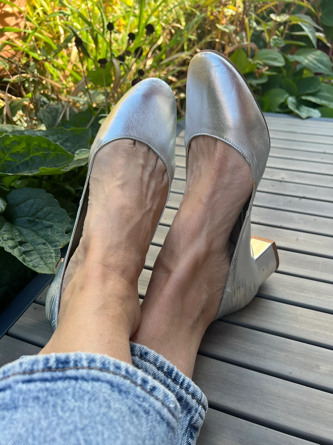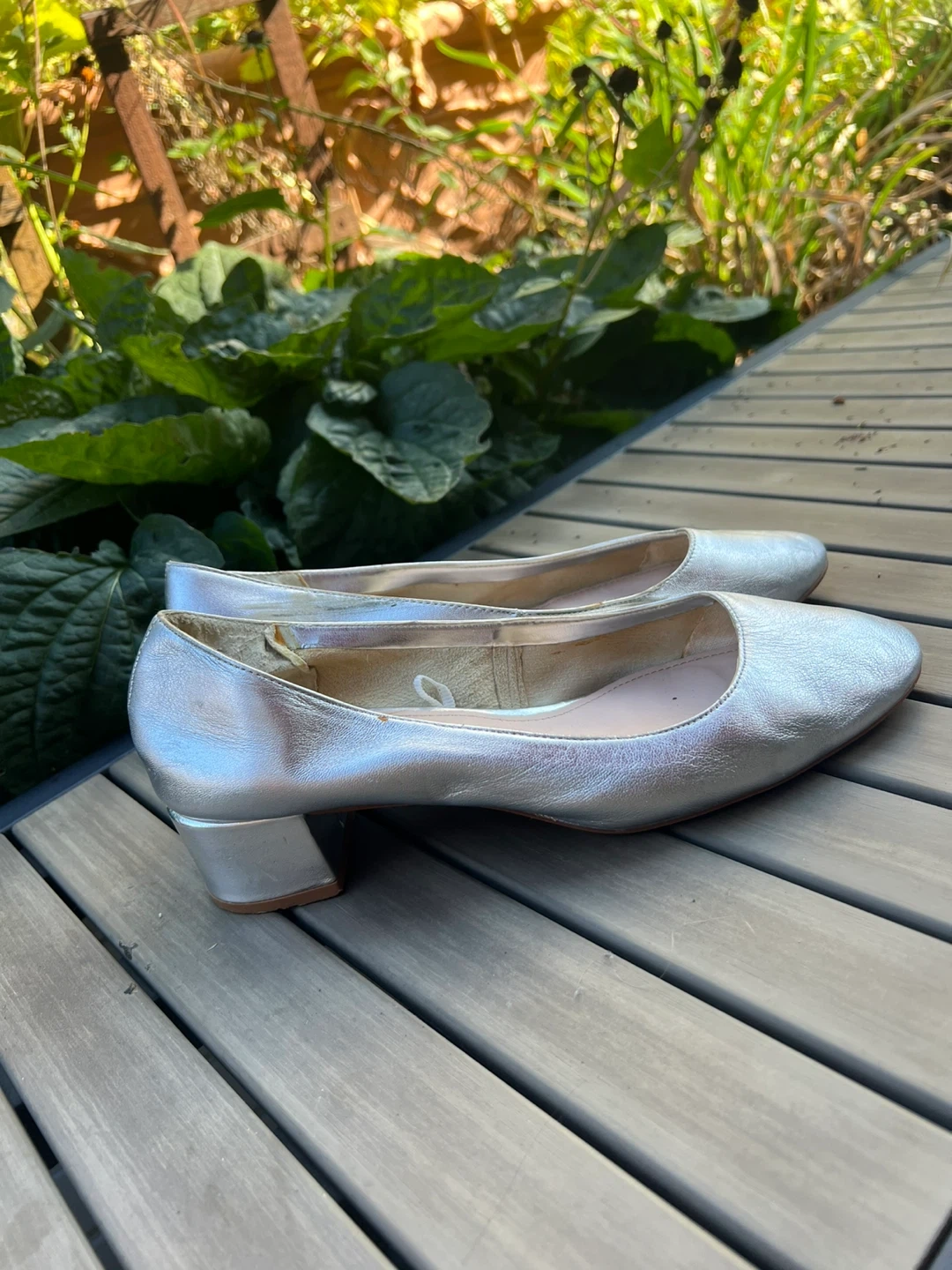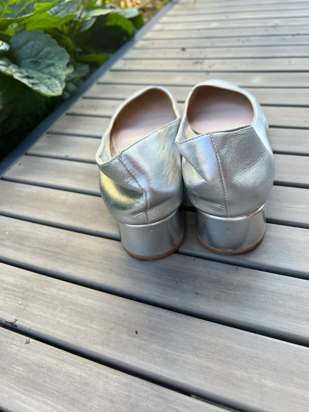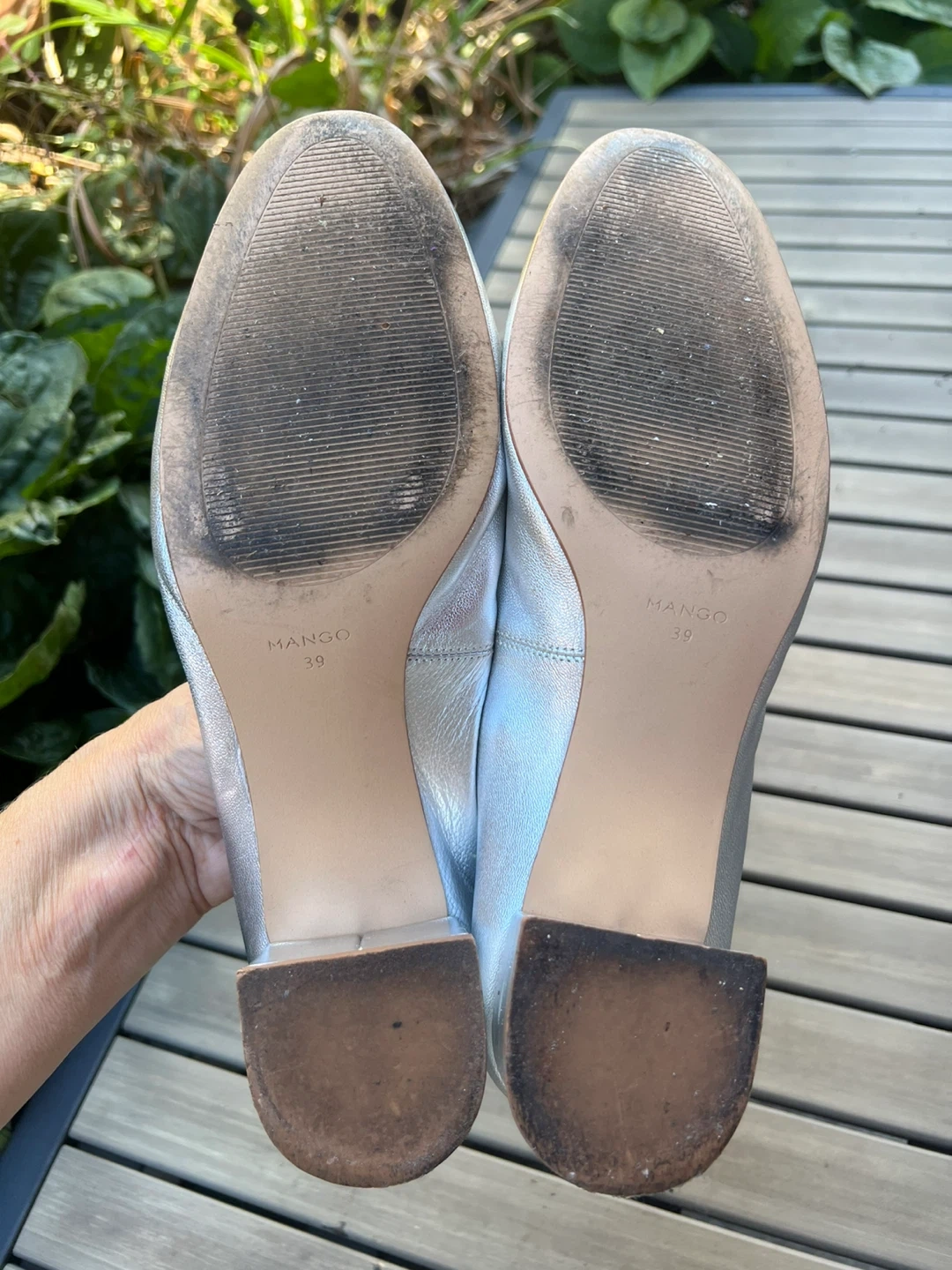 Selling a pair of Mango silver leather block heel pumps. These are a European size 39, which is approximately a US size 8.5-9 They are in fair condition