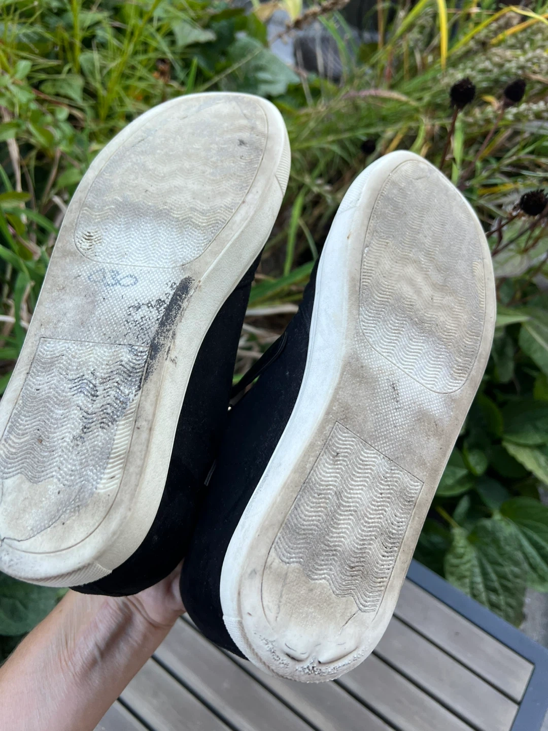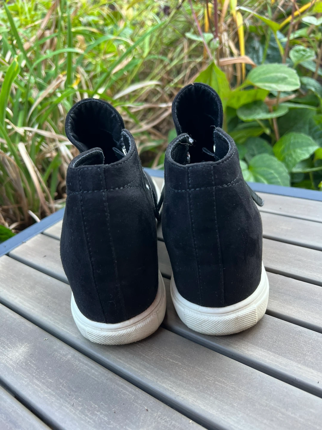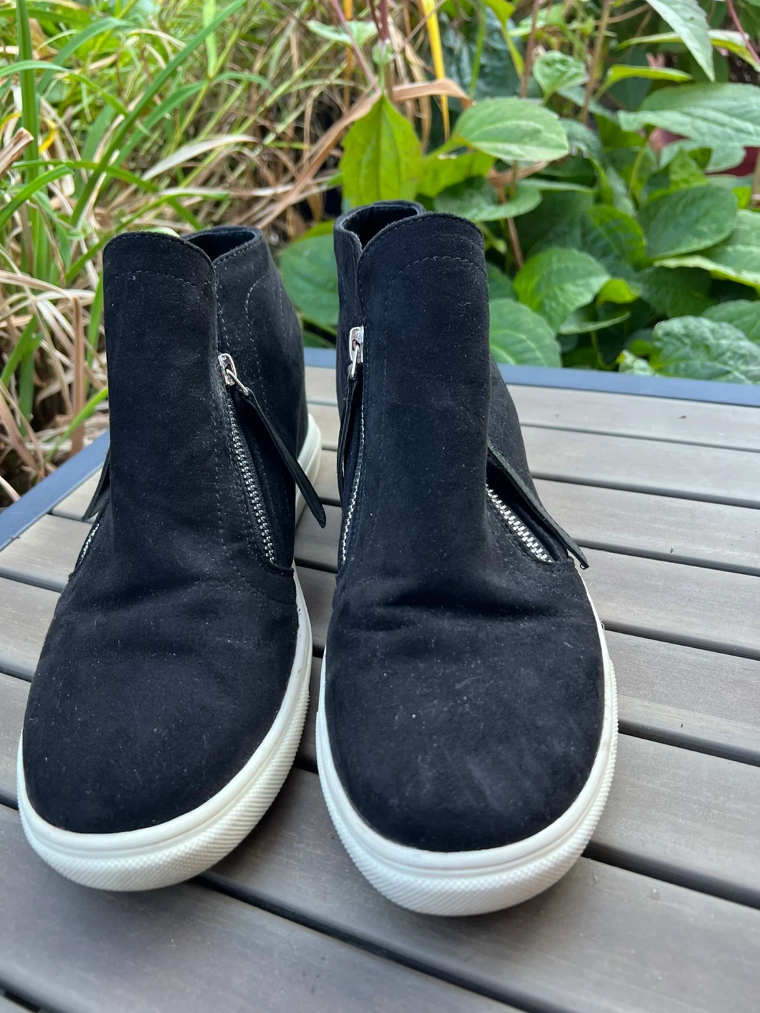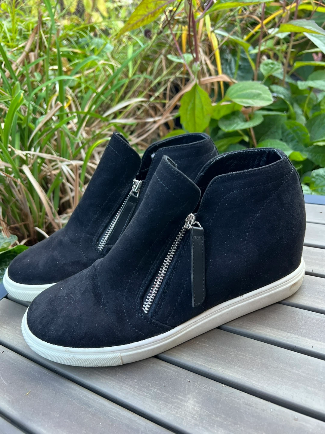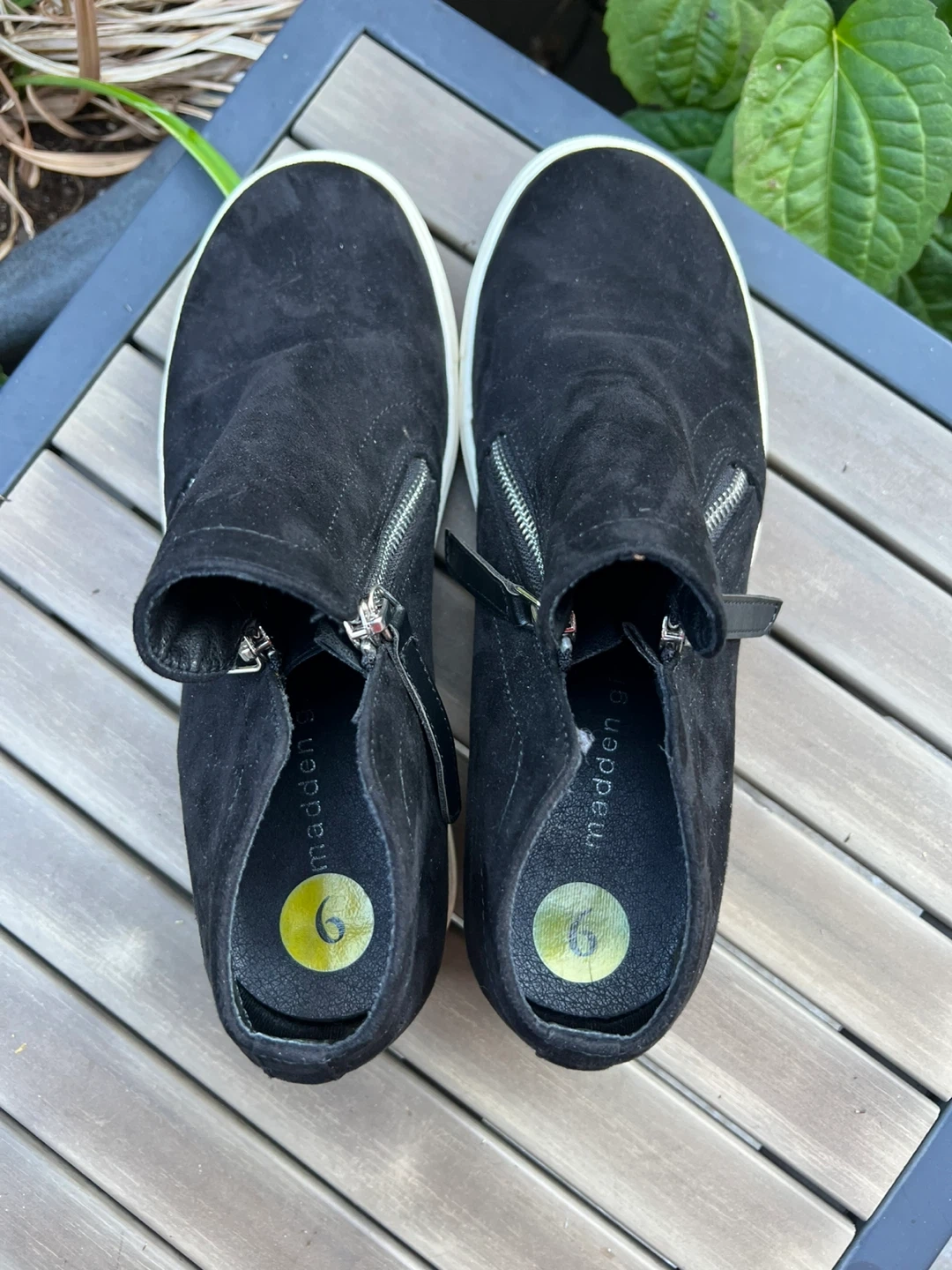 Selling a pair of Madden Girl black wedge sneakers in size 9. They have a stylish zipper detail and a comfortable wedge heel. The soles show some wear, but they're still in good condition for everyday wear