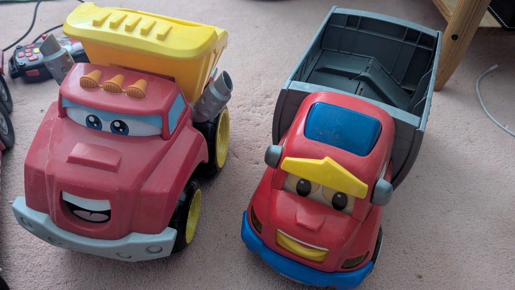 Two cute cartoon style dump trucks, great for kids who love vehicles and imaginative play! One is red with a yellow dump bed, and the other is red with a grey dump bed. Both are in good condition with electrical sounds and voices, and ready for a new home! Both together for only $10. Thank you.