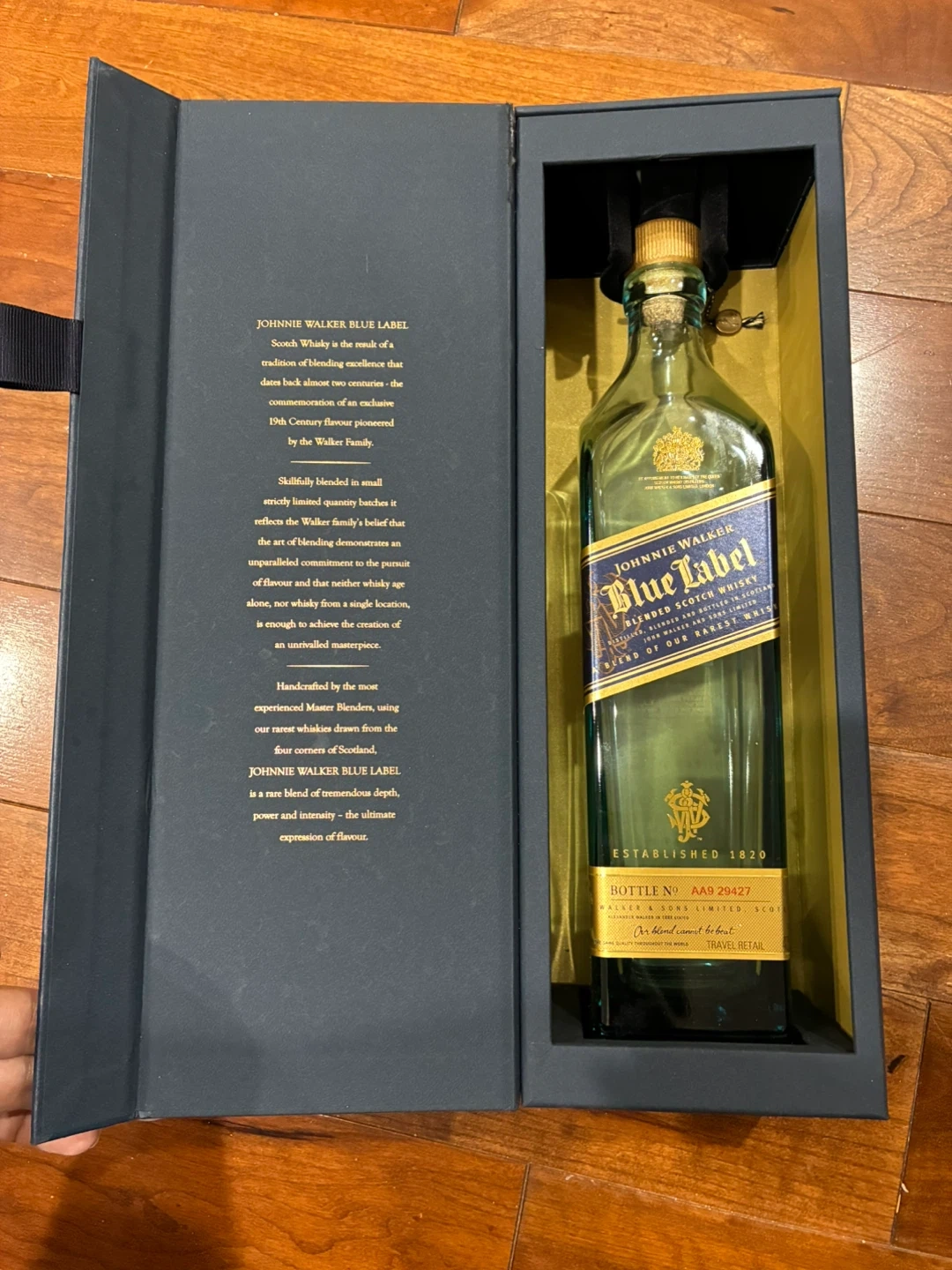 Selling an EMPTY bottle of Johnnie Walker Blue Label Blended Scotch Whisky, numbered! The EMPTY bottle comes in its original box complete w cork that has a dangling charm attached.