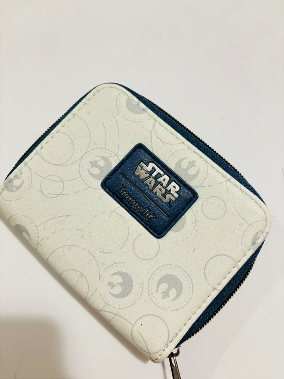 This Loungefly Star Wars wallet features a cool design with BB-8 and R2-D2. It's in great condition and perfect for any Star Wars fan! The wallet has a zip-around closure and plenty of space for cards and cash
