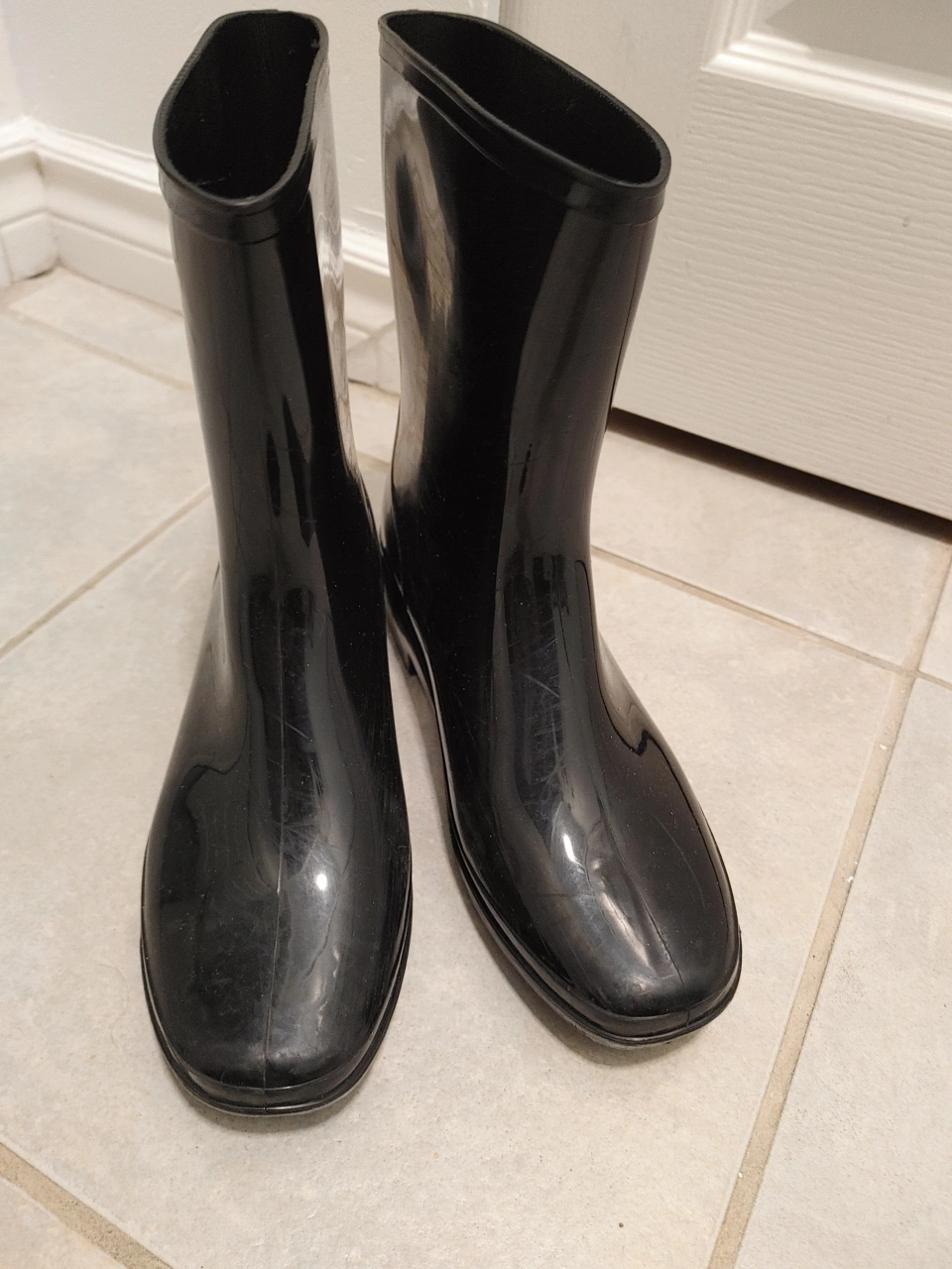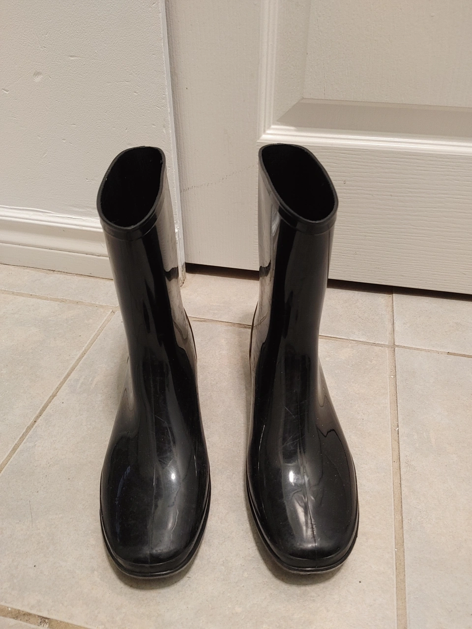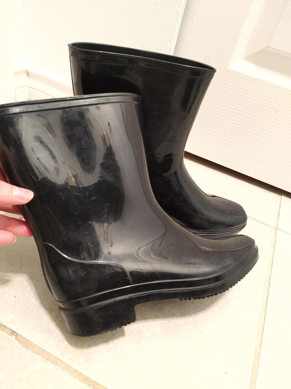 Selling a pair of black rain boots. They're in good condition and ready to keep your feet dry on those rainy days!