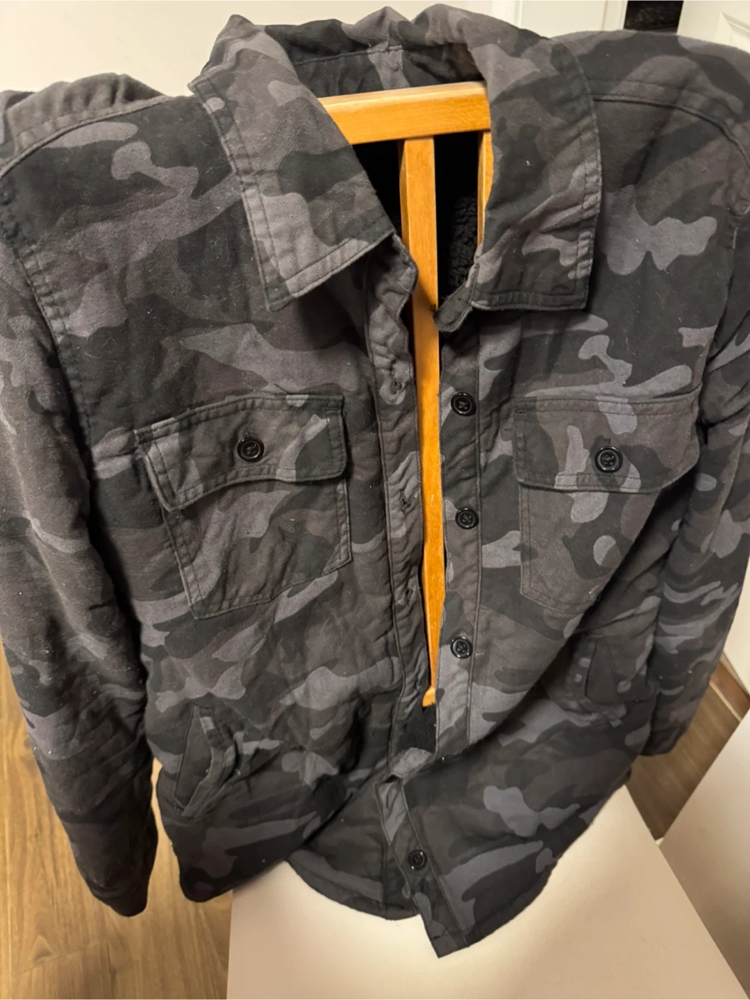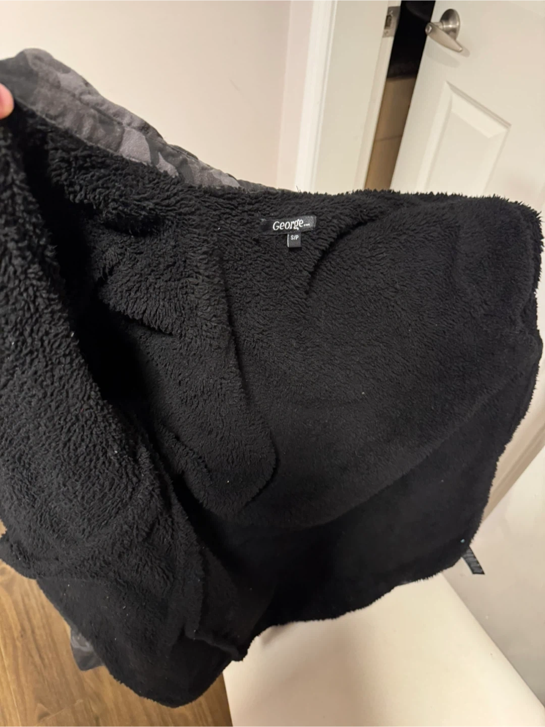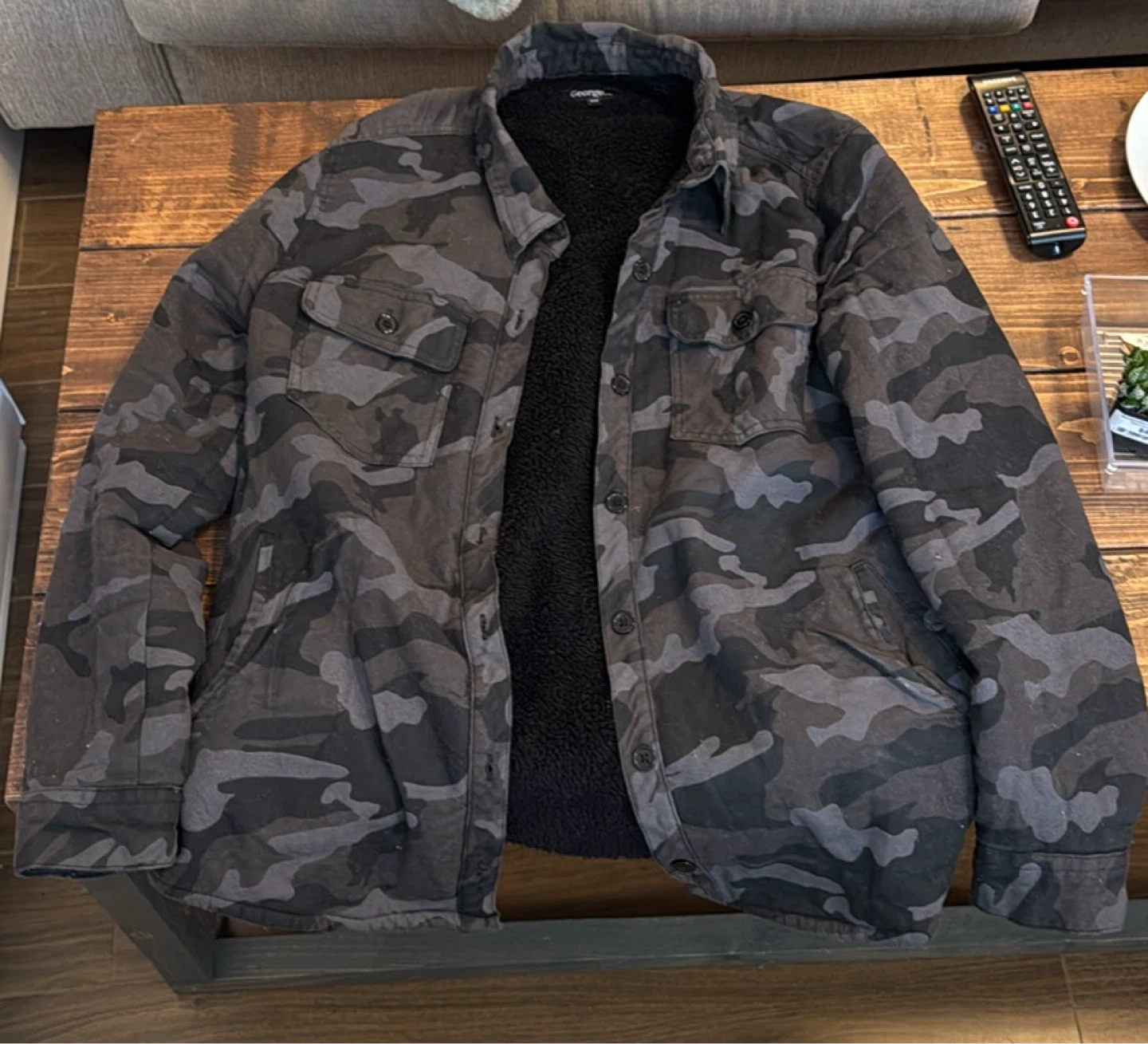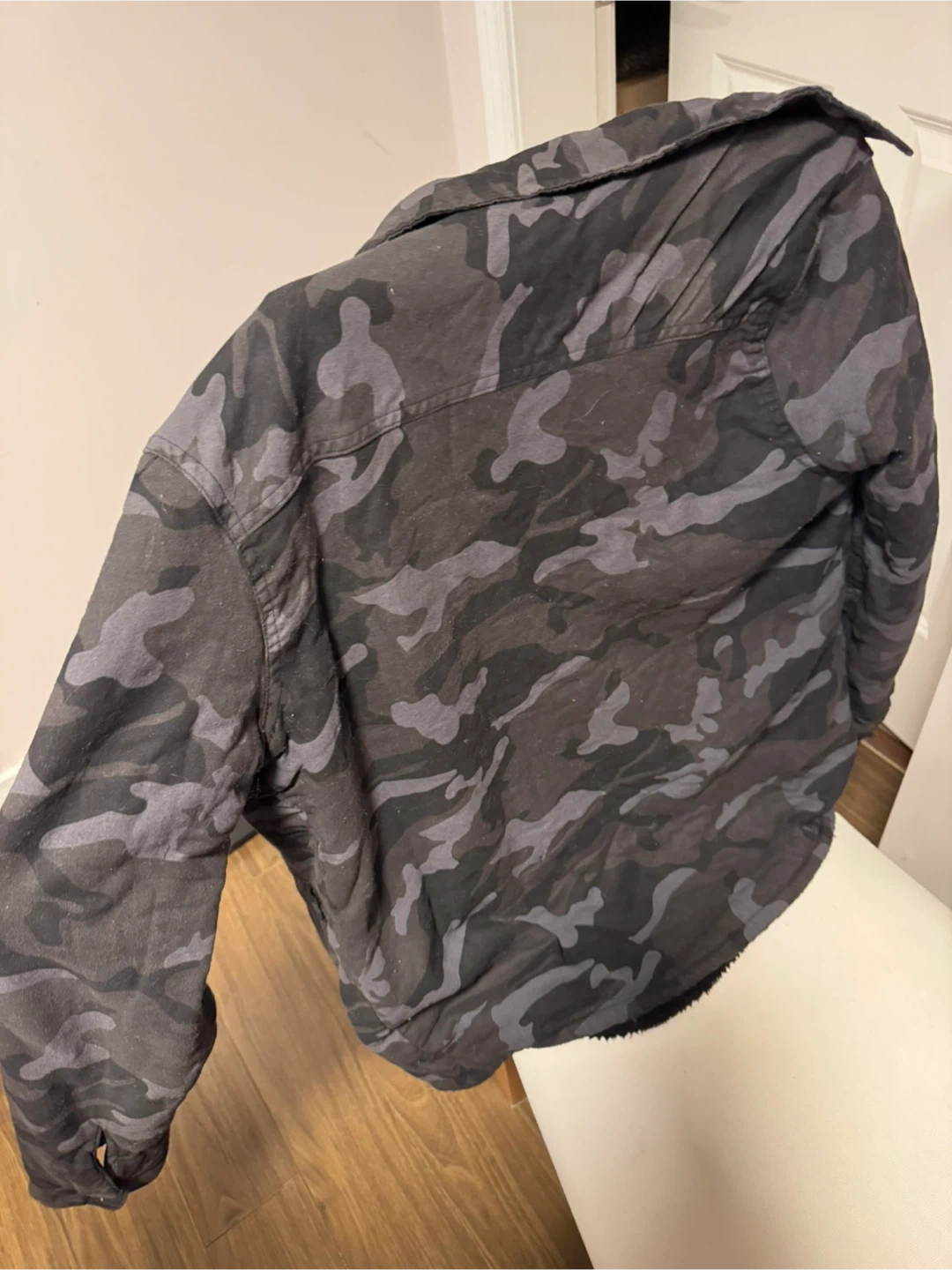 Cozy George brand jacket featuring a camouflage pattern on the outside and a soft black sherpa lining inside. It's a size small and perfect for layering during cooler weather!