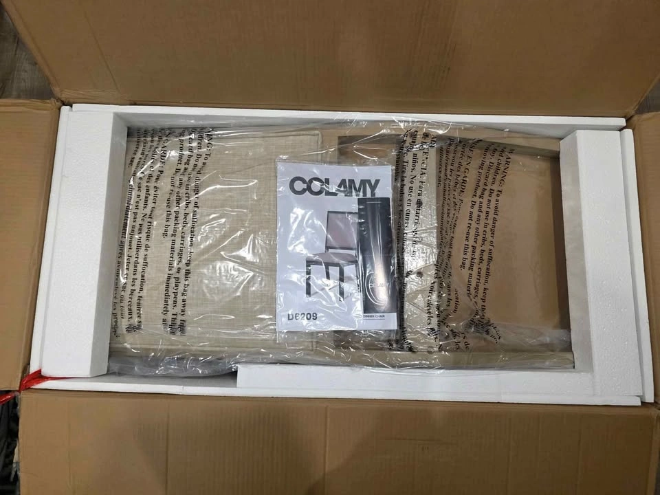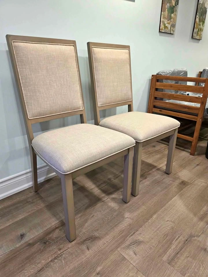 Set of 2 upholstered wood dining chairs with cushioned seats and backs. Neutral grey fabric with solid wood legs – stylish, durable, and comfortable. Can be sold assembled or disassembled in box Perfect for dining room, kitchen, living room, or café Retail $617.15 on Amazon – HUGE savings! Dimensions: H 38” × W 18.5” × D 21.8” Pickup in Vaughan Brand new from a liquidation pallet – grab a deal while it lasts!