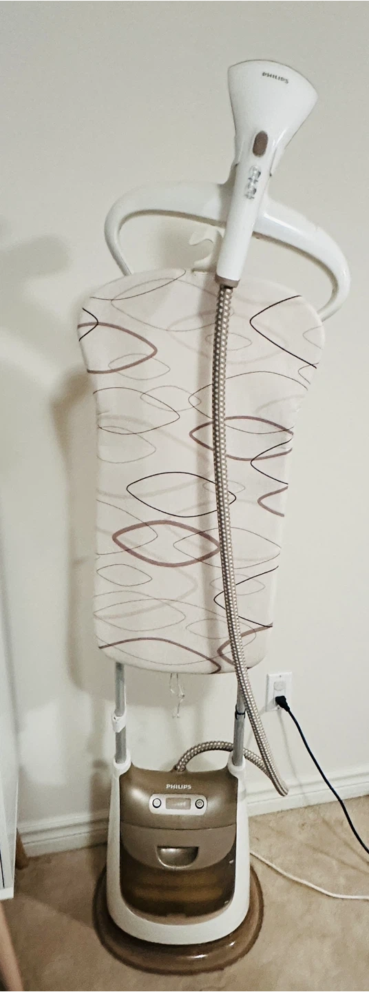 Selling a Philips garment steamer in good condition. It's perfect for quickly removing wrinkles from your clothes! The steamer features a built-in ironing board and a hanger for convenience. It's easy to use and heats up quickly, making it a great addition to your laundry routine. It has a Type G plug.