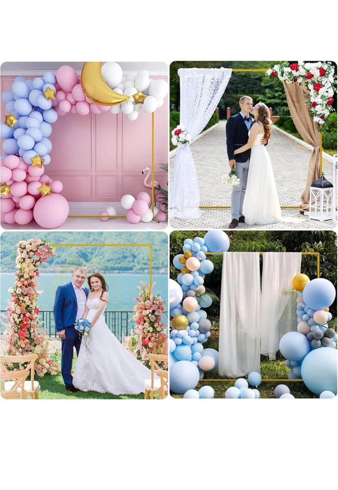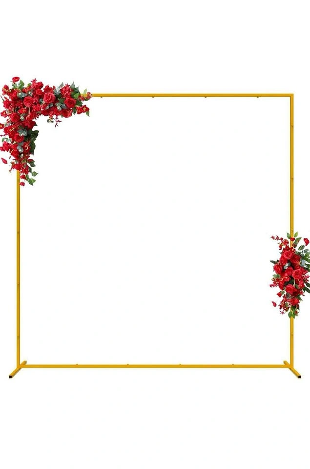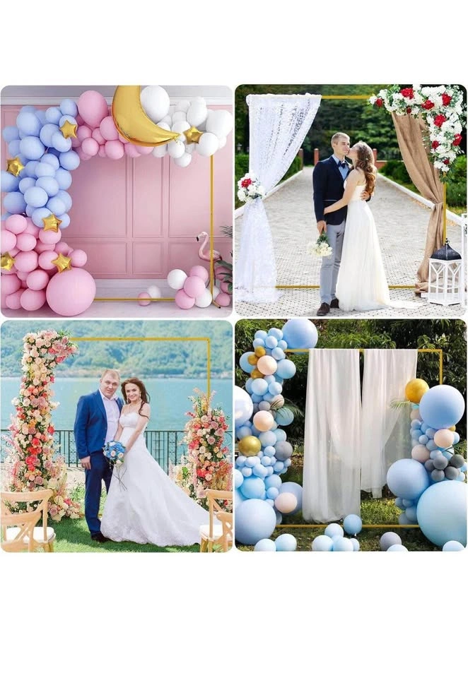 Wedding Arches for Ceremony Classy square shape and solid metallic gold construction of square gold metal arch backdrop stand will give you a robust base for an epic background for celebration. Decorate with flowers, greenery, garlands, Led lights, tulle swags, silk flowers, vines to make breathtaking backdrops for your special day. Available both indoors and outdoors. Solid Metal Steel Frame Size: 6.6ft x 6.6ft (H x W) Square pipes and sturdy in formation, this metal wedding arch can be used to create most outstanding wedding arches, door arches, balloon or floral arches. Featuring solid feet, the gold arch provides a firm and balanced support. This portable wedding arch backdrop stand can be carried easily anywhere. With heavy duty metallic construction and firm base legs, which is safe, secure, and sturdy. Versatile Arco de metal para decoracion is great for wedding, birthday party, baby showers, anniversary, graduation. Use your creativity to decorate them with flowers, plants vines, balloons, led light and so on. Valuable to get square wedding arch to fit for all your events. Additional Crossbar Built with a cross bar to reinforce its stabilities, pretty strong and tough for holding elements. Portable to space wedding arch stand at your will. The square arch is stable on it's own as long as the wing nuts screws that keep it together are secured and tight. Photo Background Stand Perfect for holding up any of our backdrops or banners, for setting up peppy photo booths, and even for home and professional studio use. The gold metal wedding arch backdrop stand is perfectly suitable for all level photographers. You can use it efficiently for both fabric and paper backgrounds. Our multipurpose backdrop support kit is durable and highly professional.