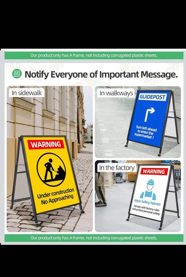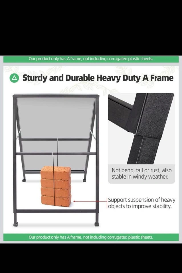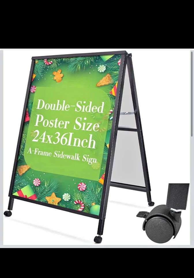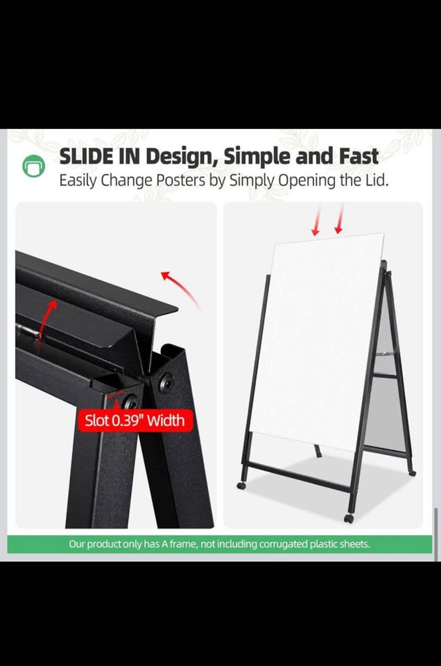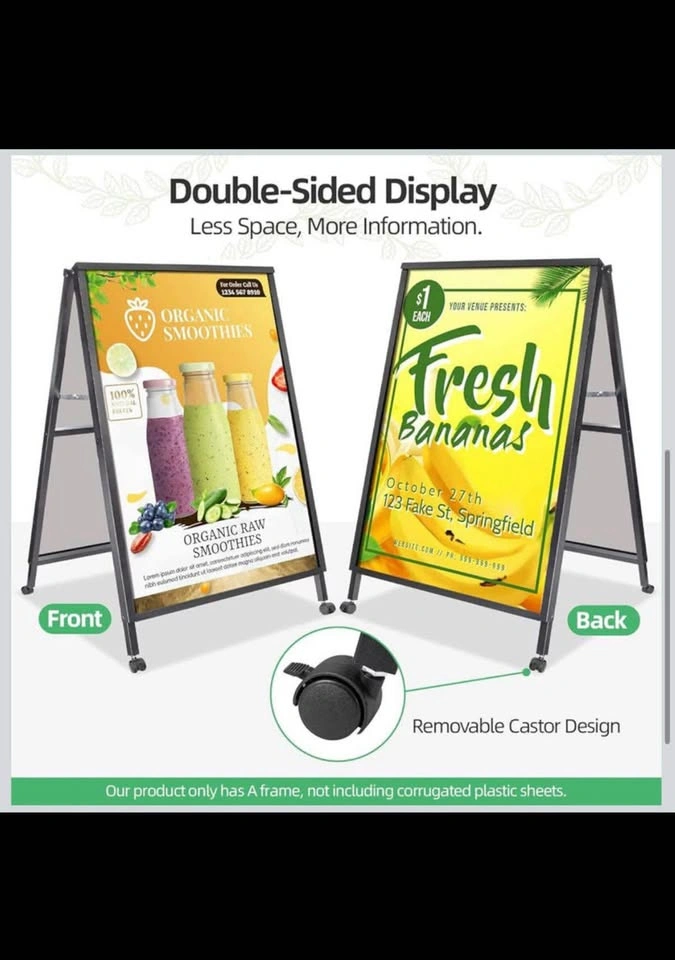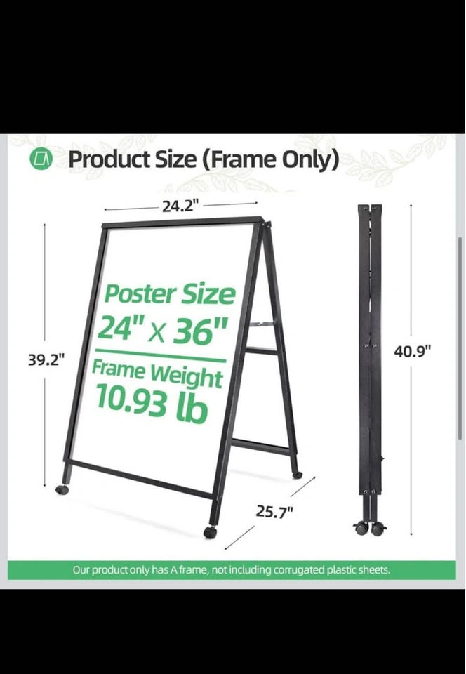 VAIIGO sidewalk sign (frame only) can display two 24x36 inch poster boards. It's portable, folding, and easy to assemble. Made of durable black metal, well suited for ads outdoors on sidewalks or shop entrances. Perfect for restaurants, stores, bars, cafes, businesses, offices, hospitals, flea markets, churches, farm stands, walkways, weddings, garage/yard sales, bakeries, exhibitions, art festivals, and special events. Great for ads, notices, posters, instructions, menus, or sales.
