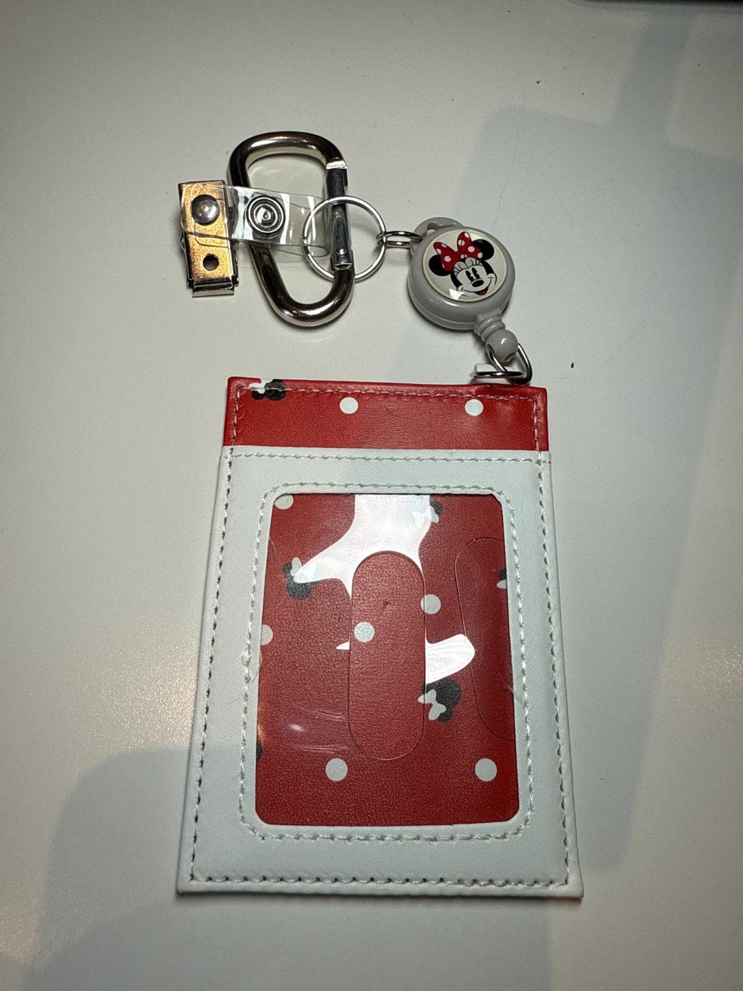 Super cute Minnie Mouse ID badge holder! It's red and white with polka dots and comes with a retractable reel for easy swiping. Perfect for work or school!